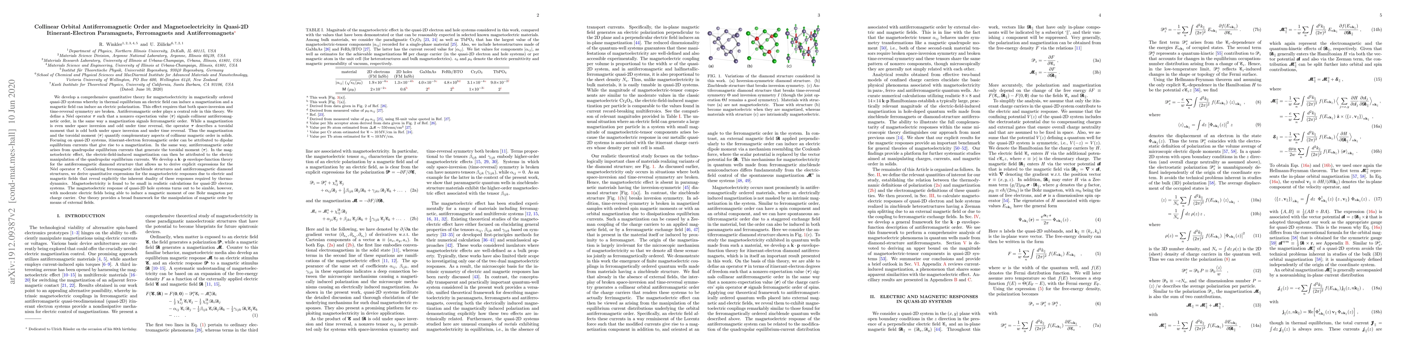 We develop a comprehensive theory for magnetoelectricity in magnetically ordered quasi-2D systems whereby in thermal equilibrium an electric field can induce a magnetization $m$ and a magnetic field can induce a polarization. This effect requires that both space-inversion and time-reversal symmetry are broken. Antiferromagnetic (AFM) order plays a central role in this theory. We define a N\'eel operator $\tau$ such that a nonzero expectation value $\langle \tau \rangle$ signals AFM order, in the same way $m$ signals ferromagnetic (FM) order. While $m$ is even under space inversion and odd under time reversal, $\tau$ describes a toroidal moment that is odd under both symmetries. Thus $m$ and $\langle \tau \rangle$ quantify complementary aspects of magnetic order in solids. In quasi-2D systems FM order can be attributed to dipolar equilibrium currents that give rise to $m$. In the same way, AFM order arises from quadrupolar currents that generate the moment $\langle \tau \rangle$. The electric-field-induced magnetization can then be attributed to the electric manipulation of the quadrupolar currents. We develop a $k \cdot p$ envelope-function theory for AFM diamond structures that allows us to derive explicit expressions for the operator $\tau$. Considering FM zincblende and AFM diamond, we derive quantitative expressions for the magnetoelectric responses due to electric and magnetic fields that reveal explicitly the inherent duality of these responses required by thermodynamics. Magnetoelectricity is found to be small in realistic calculations for quasi-2D electron systems. The magnetoelectric response of quasi-2D hole systems turns out to be sizable, however, with moderate electric fields being able to induce a magnetic moment of one Bohr magneton per charge carrier. Our theory provides a broad framework for the manipulation of magnetic order by means of external fields.
