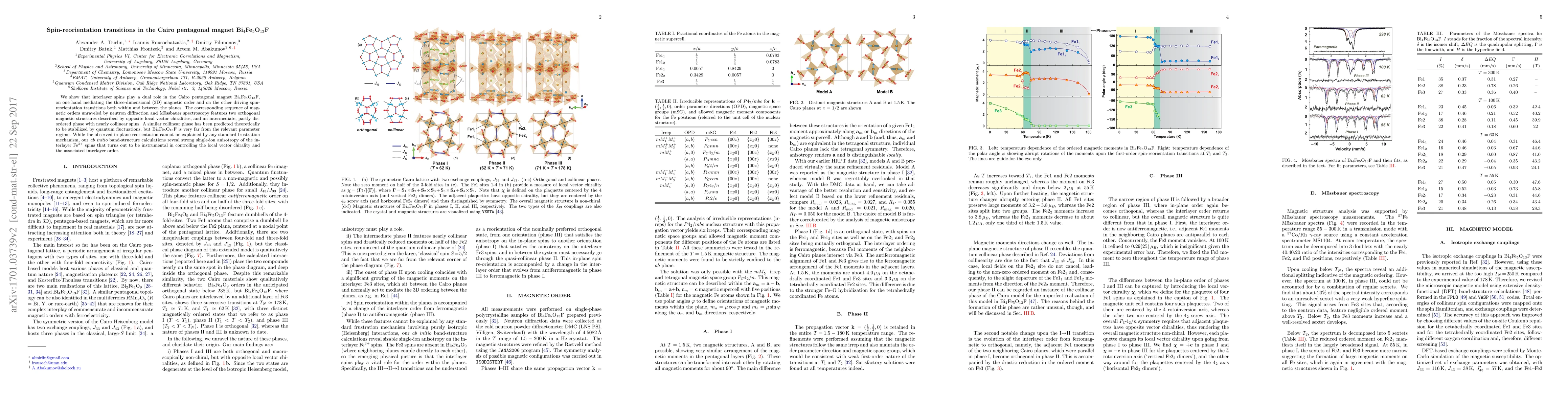This paper investigates the magnetic order and spin-reorientation transitions in the Cairo pentagonal magnet Bi$_4$Fe$_5$O$_{13}$F, revealing interlayer spins' dual role in mediating 3D magnetic order and driving transitions. The study uncovers a collinear phase and two orthogonal magnetic structures, with strong single-ion anisotropy of interlayer Fe$^{3+}$ spins controlling local vector chirality.
