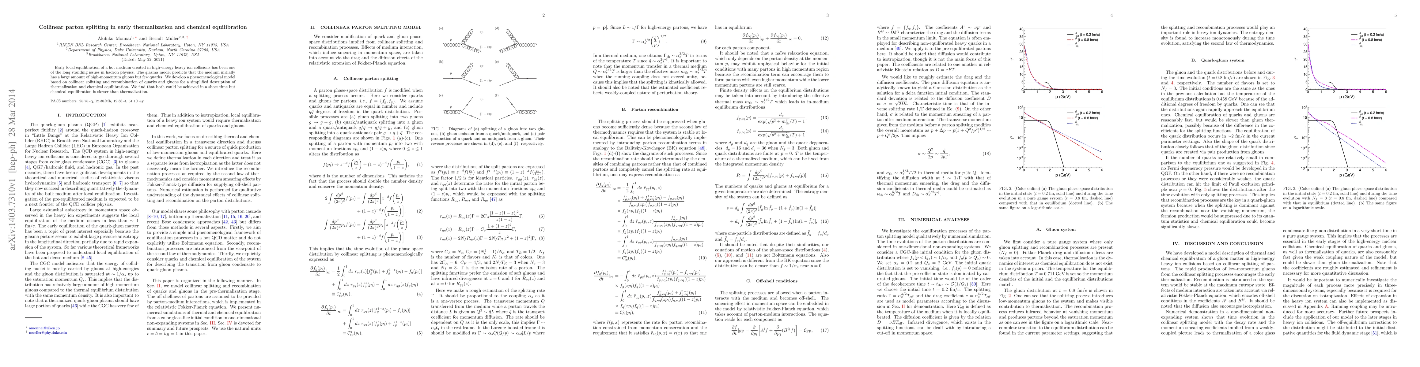 This paper develops a phenomenological model based on collinear parton splitting to describe thermalization and chemical equilibration in a hot medium from high-energy heavy ion collisions. It finds that thermalization occurs quickly, but chemical equilibration is slower.