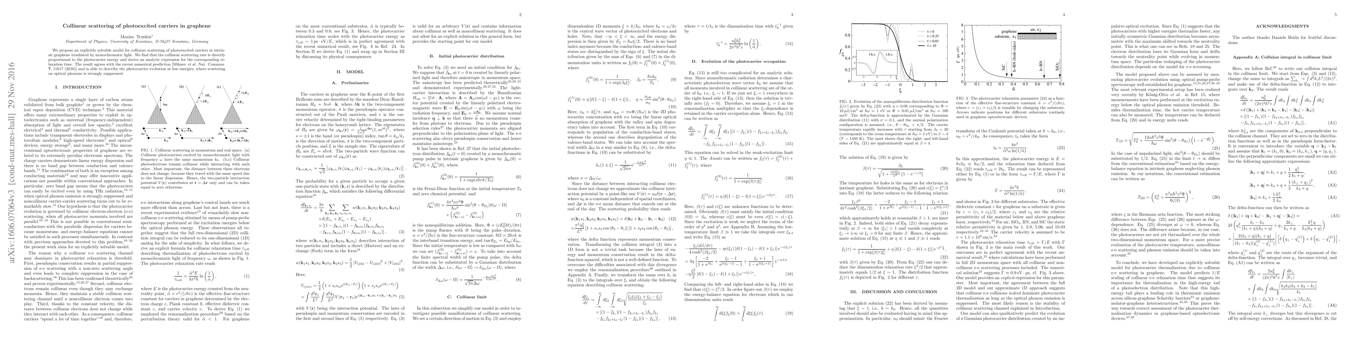 This paper presents a solvable model for collinear scattering of photoexcited carriers in graphene, showing a direct proportionality between the scattering rate and photocarrier energy, and deriving an analytic expression for relaxation time that aligns with recent numerical predictions. It effectively describes photocarrier dynamics at low energies where optical phonon scattering is minimal.