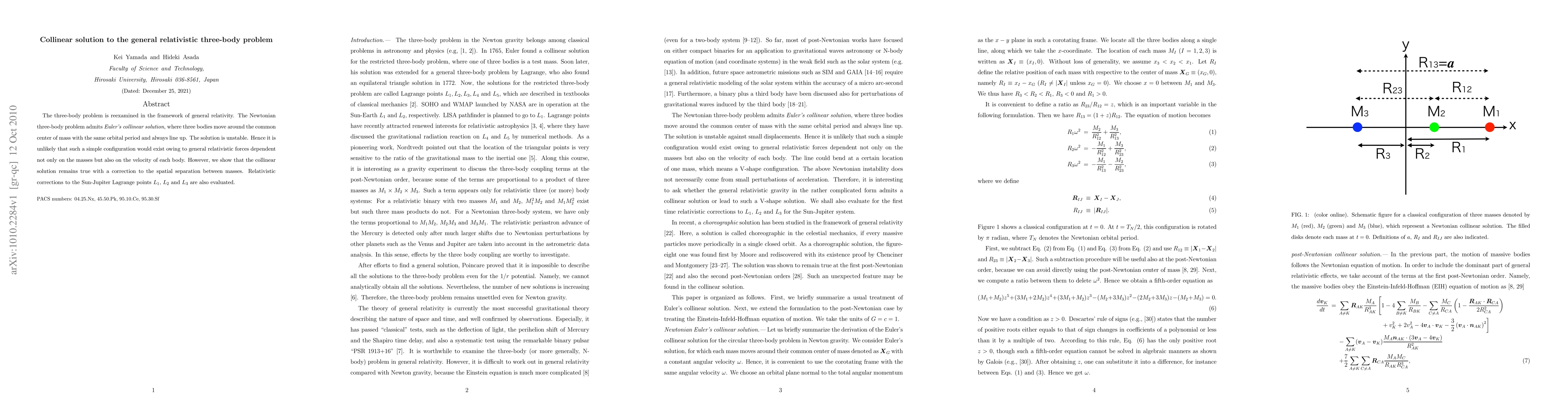 This paper examines the general relativistic three-body problem and discovers that Euler's collinear solution persists with a corrected spatial separation, despite general relativistic forces. Additionally, it evaluates relativistic corrections to the Sun-Jupiter Lagrange points L1, L2, and L3.