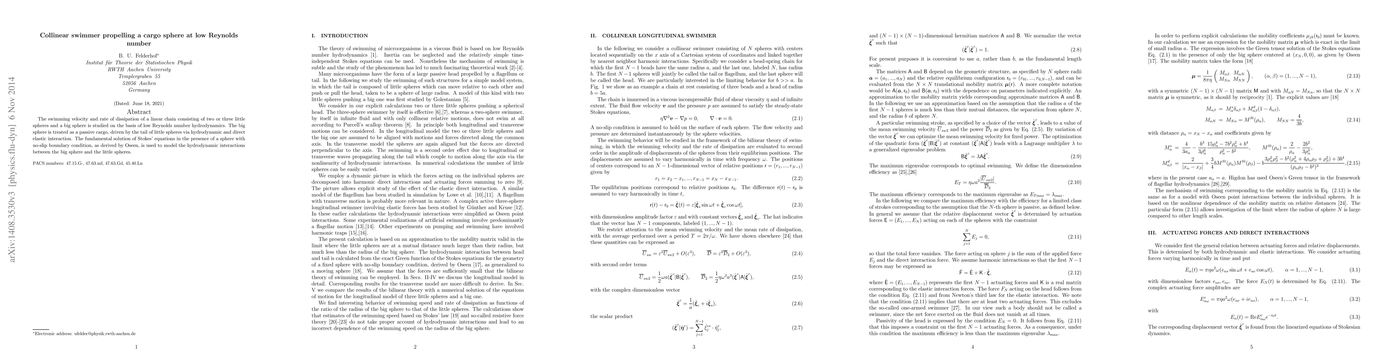 The swimming velocity and rate of dissipation of a linear chain consisting of two or three little spheres and a big sphere is studied on the basis of low Reynolds number hydrodynamics. The big sphere is treated as a passive cargo, driven by the tail of little spheres via hydrodynamic and direct elastic interaction. The fundamental solution of Stokes' equations in the presence of a sphere with no-slip boundary condition, as derived by Oseen, is used to model the hydrodynamic interactions between the big sphere and the little spheres.
