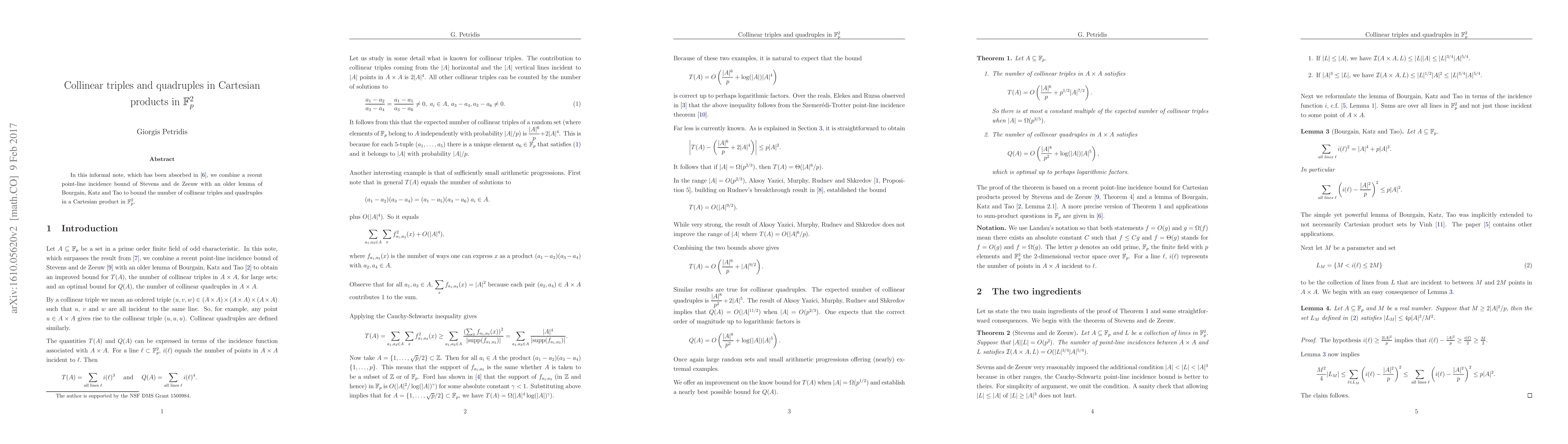 In this ote, which has been absorbed by arXiv1702.01003, we combine a recent point-line incidence bound of Stevens and de Zeeuw with an older lemma of Bourgain, Katz and Tao to bound the number of collinear triples and quadruples in a Cartesian product in $\mathbb{F}_p^2$.
