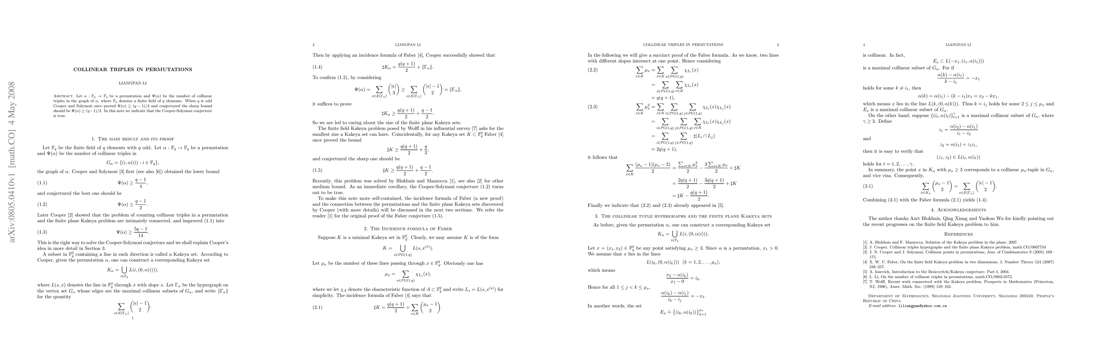 Let $\alpha:\mathbb{F}_q\to\mathbb{F}_q$ be a permutation and $\Psi(\alpha)$ be the number of collinear triples in the graph of $\alpha$, where $\mathbb{F}_q$ denotes a finite field of $q$ elements. When $q$ is odd Cooper and Solymosi once proved $\Psi(\alpha)\geq(q-1)/4$ and conjectured the sharp bound should be $\Psi(\alpha)\geq(q-1)/2$. In this note we indicate that the Cooper-Solymosi conjecture is true.