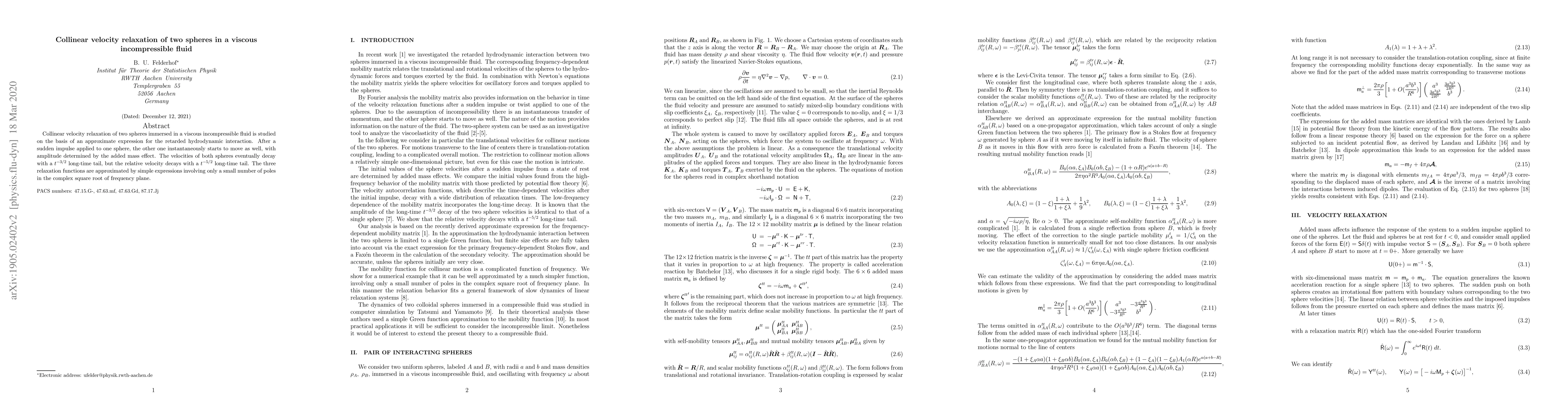 This paper investigates the collinear velocity relaxation of two spheres in a viscous incompressible fluid, focusing on the hydrodynamic interaction. The study reveals that after an initial impulse, the spheres' velocities decay over time with a t^{-3/2} tail, while the relative velocity decays with a t^{-5/2} tail, approximated by simple expressions involving a few poles in the complex frequency plane.
