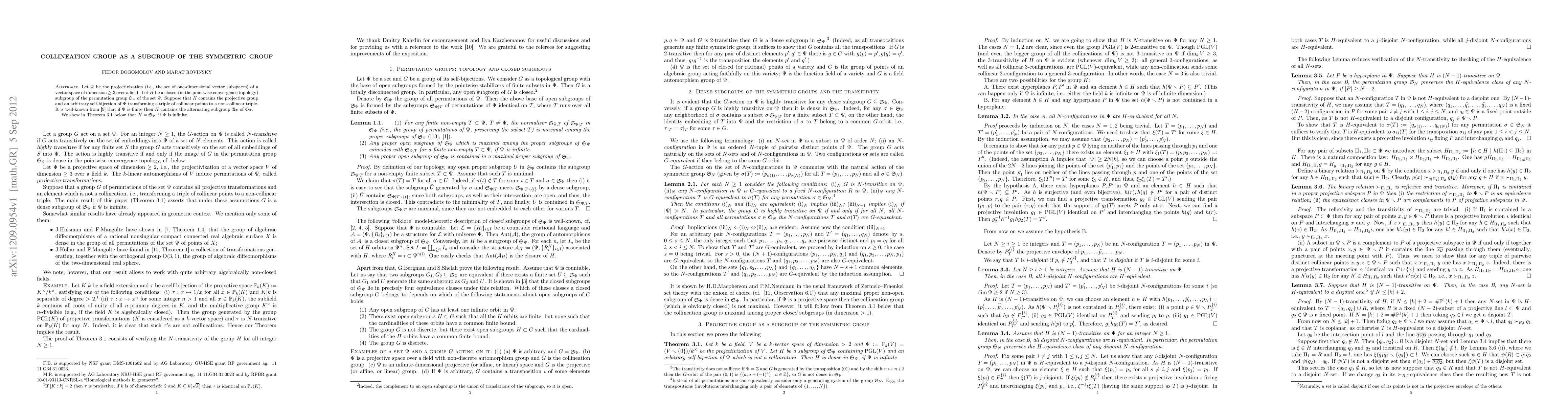 The paper investigates the collineation group as a subgroup of the symmetric group, focusing on its properties and behavior over fields, both finite and infinite.