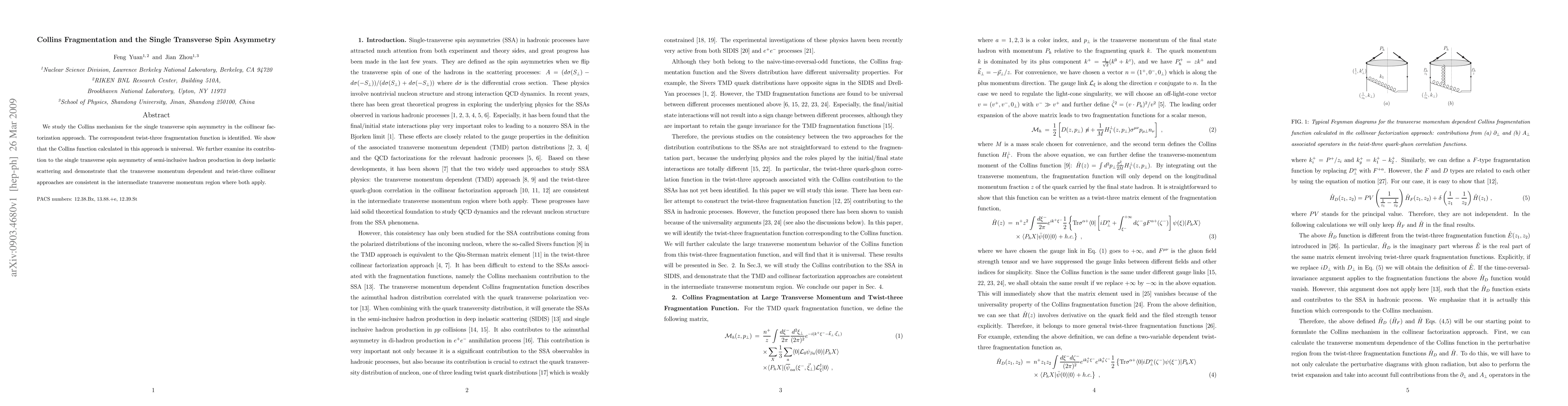 This paper investigates the Collins mechanism's role in single transverse spin asymmetry within the collinear factorization approach, identifying the corresponding twist-three fragmentation function. It demonstrates that the calculated Collins function is universal and consistent between transverse momentum dependent and twist-three collinear approaches in intermediate transverse momentum regions.