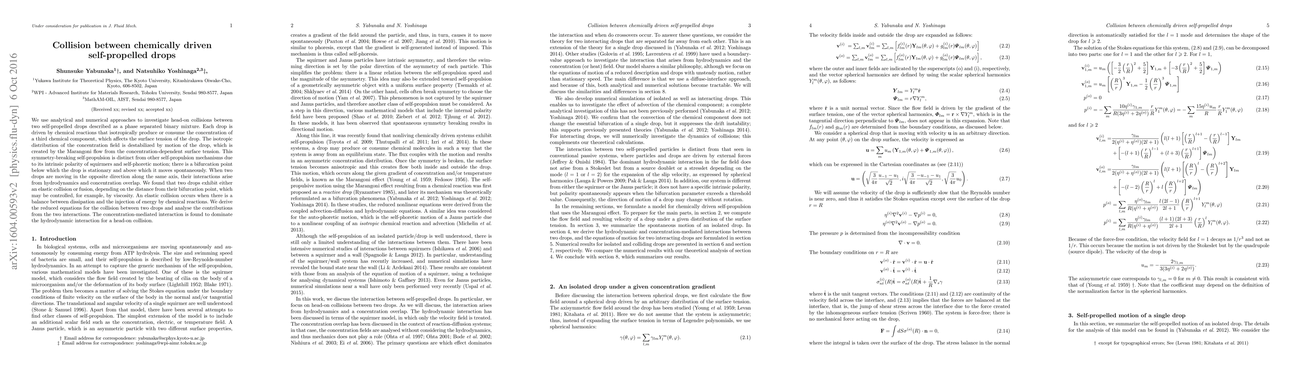 Two self-propelled drops collide with either an elastic collision or fusion depending on their distance from a bifurcation point, influenced by hydrodynamics and chemical reactions.