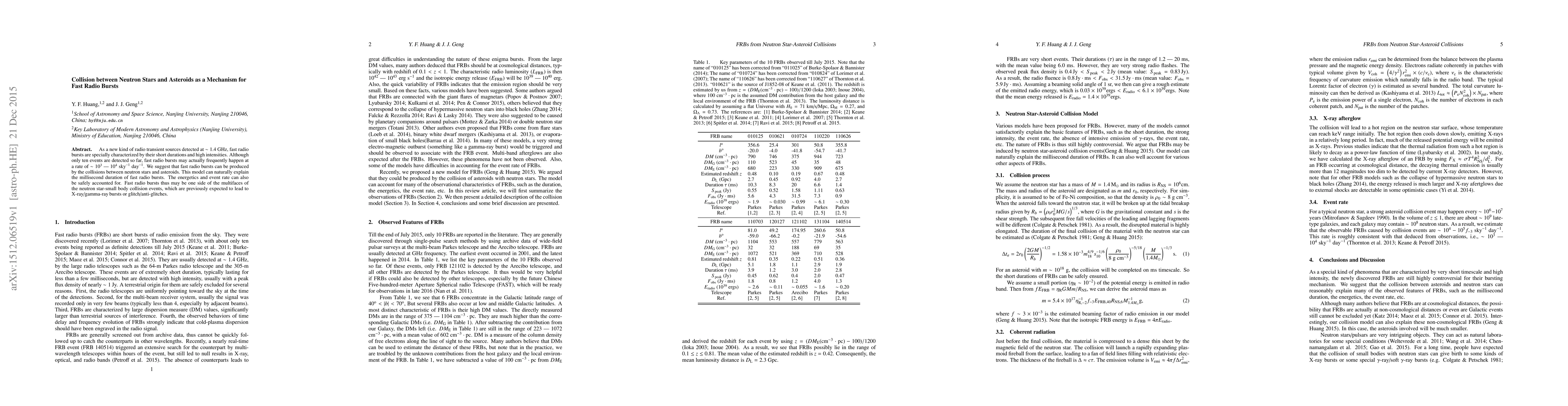 Summary: This paper proposes that fast radio bursts, characterized by short durations and high intensities, could be generated by collisions between neutron stars and asteroids. This model explains the bursts' millisecond durations and aligns with the estimated event rates, suggesting these collisions are a frequent source of such radio transients.