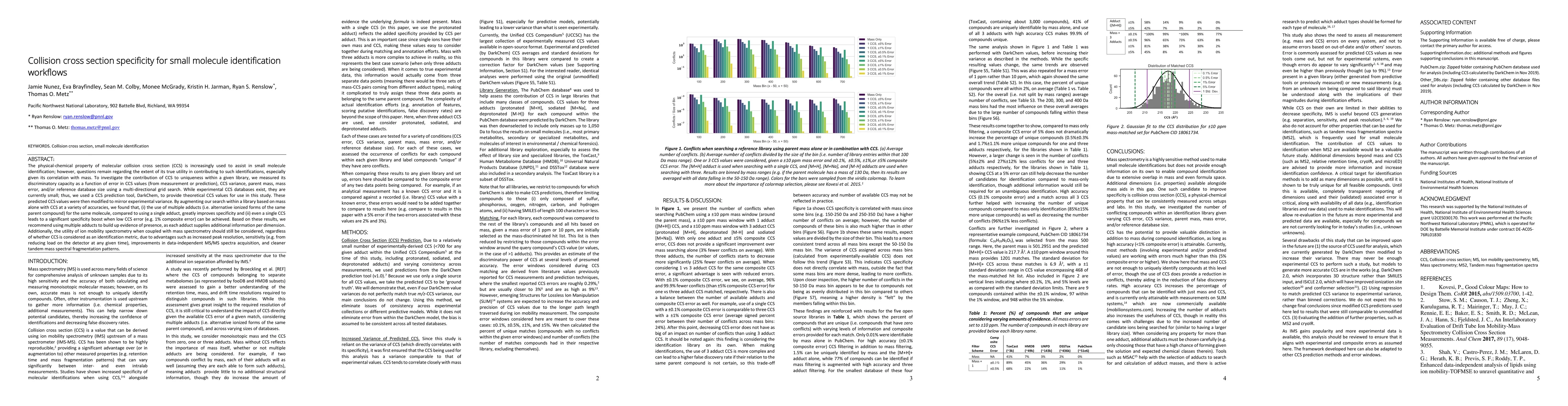 This study investigates the role of collision cross section (CCS) in small molecule identification, finding that using multiple adducts significantly enhances specificity. Even low CCS error (e.g., 1%) provides a notable boost in identification accuracy, suggesting the utility of ion mobility spectrometry in conjunction with mass spectrometry for improved resolution and sensitivity.