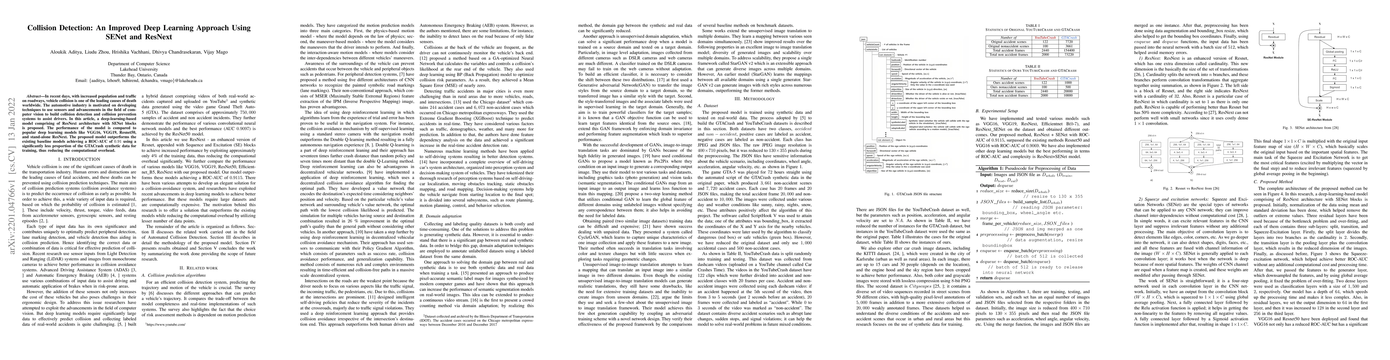 The paper proposes a deep learning model using ResNext architecture with SENet blocks for collision detection, outperforming other models like VGG16, VGG19, and Resnet50. It achieves a high ROC-AUC of 0.91 with less training data, reducing computational needs.