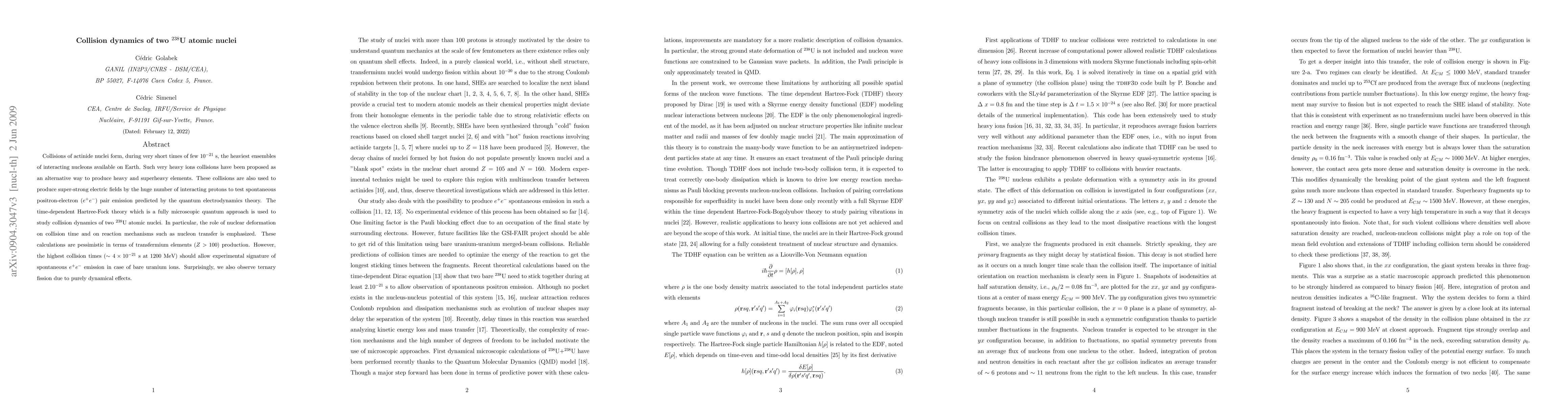 Collisions of actinide nuclei form, during very short times of few $10^{-21}$ s, the heaviest ensembles of interacting nucleons available on Earth. Such very heavy ions collisions have been proposed as an alternative way to produce heavy and superheavy elements. These collisions are also used to produce super-strong electric fields by the huge number of interacting protons to test spontaneous positron-electron ($e^+e^-$) pair emission predicted by the quantum electrodynamics theory. The time-dependent Hartree-Fock theory which is a fully microscopic quantum approach is used to study collision dynamics of two $^{238}$U atomic nuclei. In particular, the role of nuclear deformation on collision time and on reaction mechanisms such as nucleon transfer is emphasized. These calculations are pessimistic in terms of transfermium elements ($Z>100$) production. However, the highest collision times ($\sim4\times10^{-21}$ s at 1200 MeV) should allow experimental signature of spontaneous $e^+e^-$ emission. Surprisingly, we also observe ternary fission due to purely dynamical effects.