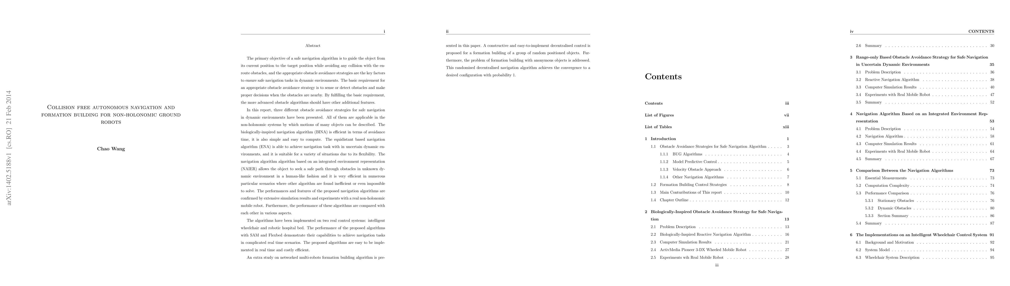 The primary objective of a safe navigation algorithm is to guide the object from its current position to the target position while avoiding any collision with the en-route obstacles, and the appropriate obstacle avoidance strategies are the key factors to ensure safe navigation tasks in dynamic environments. In this report, three different obstacle avoidance strategies for safe navigation in dynamic environments have been presented. The biologically-inspired navigation algorithm (BINA) is efficient in terms of avoidance time. The equidistant based navigation algorithm (ENA) is able to achieve navigation task with in uncertain dynamic environments. The navigation algorithm algorithm based on an integrated environment representation (NAIER) allows the object to seek a safe path through obstacles in unknown dynamic environment in a human-like fashion. The performances and features of the proposed navigation algorithms are confirmed by extensive simulation results and experiments with a real non-holonomic mobile robot. The algorithms have been implemented on two real control systems: intelligent wheelchair and robotic hospital bed. The performance of the proposed algorithms with SAM and Flexbed demonstrate their capabilities to achieve navigation tasks in complicated real time scenarios. The proposed algorithms are easy to be implemented in real time and costly efficient. An extra study on networked multi-robots formation building algorithm is presented in this paper. A constructive and easy-to-implement decentralised control is proposed for a formation building of a group of random positioned objects. Furthermore, the problem of formation building with anonymous objects is addressed. This randomised decentralised navigation algorithm achieves the convergence to a desired configuration with probability 1.