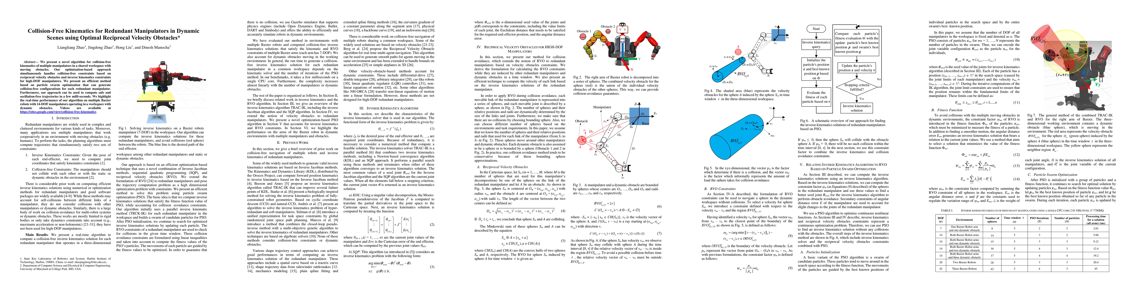 This paper introduces a novel optimization algorithm for collision-free kinematics of redundant manipulators in dynamic environments using reciprocal velocity obstacles. It employs particle swarm optimization to generate safe, oscillation-free trajectories in real-time, demonstrated effectively on Baxter robots with 14-DOF manipulators.