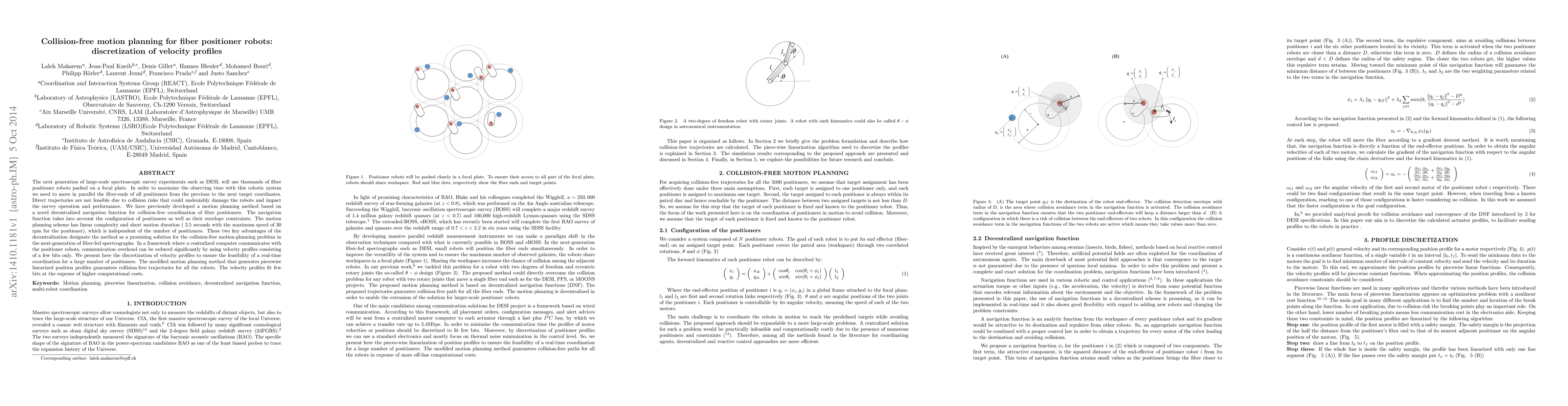 This paper proposes a collision-free motion planning method for fiber positioner robots using a decentralized navigation function, ensuring efficient coordination and minimizing communication overhead. The method discretizes velocity profiles to enable real-time coordination for large numbers of robots while maintaining collision-free trajectories.
