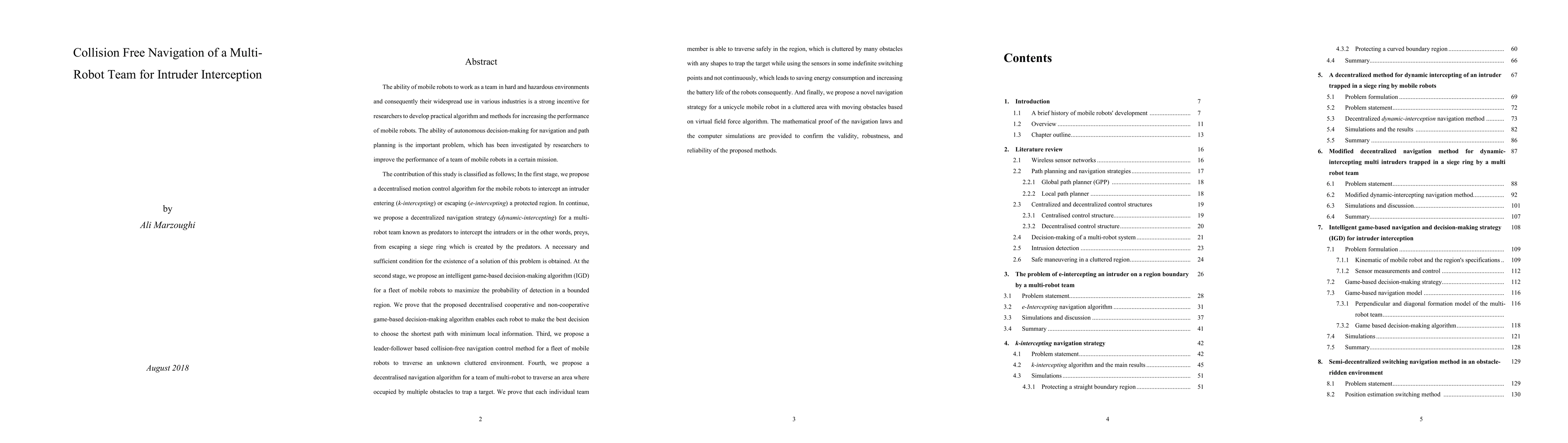 In this report, we propose a decentralised motion control algorithm for the mobile robots to intercept an intruder entering (k-intercepting) or escaping (e-intercepting) a protected region. In continuation, we propose a decentralized navigation strategy (dynamic-intercepting) for a multi-robot team known as predators to intercept the intruders or in the other words, preys, from escaping a siege ring which is created by the predators. A necessary and sufficient condition for the existence of a solution of this problem is obtained. Furthermore, we propose an intelligent game-based decision-making algorithm (IGD) for a fleet of mobile robots to maximize the probability of detection in a bounded region. We prove that the proposed decentralised cooperative and non-cooperative game-based decision-making algorithm enables each robot to make the best decision to choose the shortest path with minimum local information. Then we propose a leader-follower based collision-free navigation control method for a fleet of mobile robots to traverse an unknown cluttered environment where is occupied by multiple obstacles to trap a target. We prove that each individual team member is able to traverse safely in the region, which is cluttered by many obstacles with any shapes to trap the target while using the sensors in some indefinite switching points and not continuously, which leads to saving energy consumption and increasing the battery life of the robots consequently. And finally, we propose a novel navigation strategy for a unicycle mobile robot in a cluttered area with moving obstacles based on virtual field force algorithm. The mathematical proof of the navigation laws and the computer simulations are provided to confirm the validity, robustness, and reliability of the proposed methods.