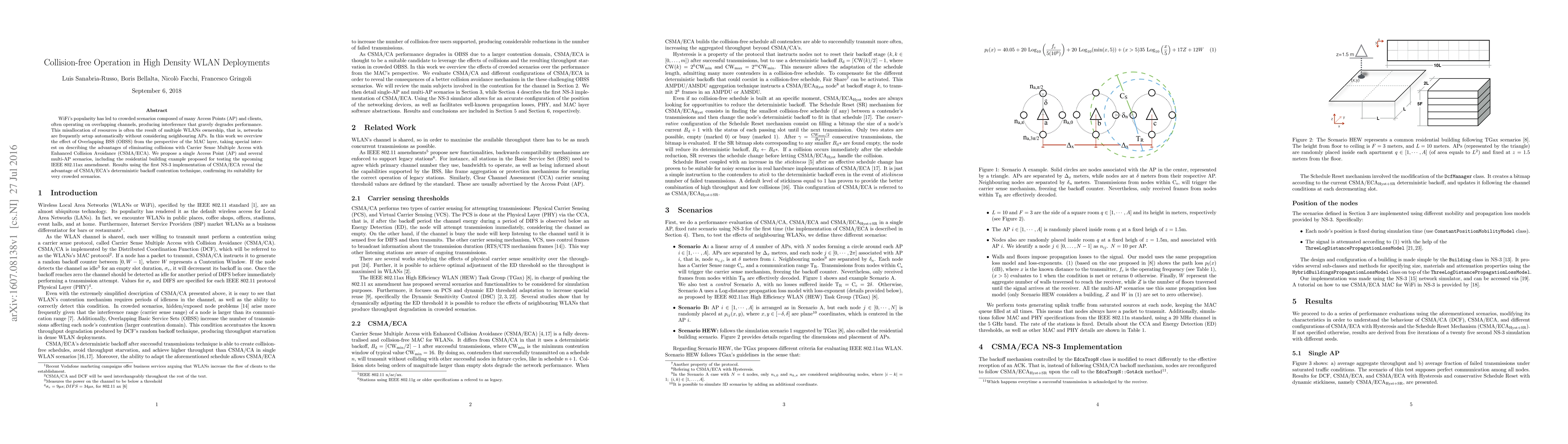 WiFi's popularity has led to crowded scenarios composed of many Access Points (AP) and clients, often operating on overlapping channels, producing interference that gravely degrades performance. This misallocation of resources is often the result of multiple WLANs ownership, that is, networks are frequently setup automatically without considering neighbouring APs. In this work we overview the effect of Overlapping BSS (OBSS) from the perspective of the MAC layer, taking special interest on describing the advantages of eliminating collisions with Carrier Sense Multiple Access with Enhanced Collision Avoidance (CSMA/ECA). We propose a single Access Point (AP) and several multi-AP scenarios, including the residential building example proposed for testing the upcoming IEEE 802.11ax amendment. Results using the first NS-3 implementation of CSMA/ECA reveal the advantage of CSMA/ECA's deterministic backoff contention technique, confirming its suitability for very crowded scenarios.