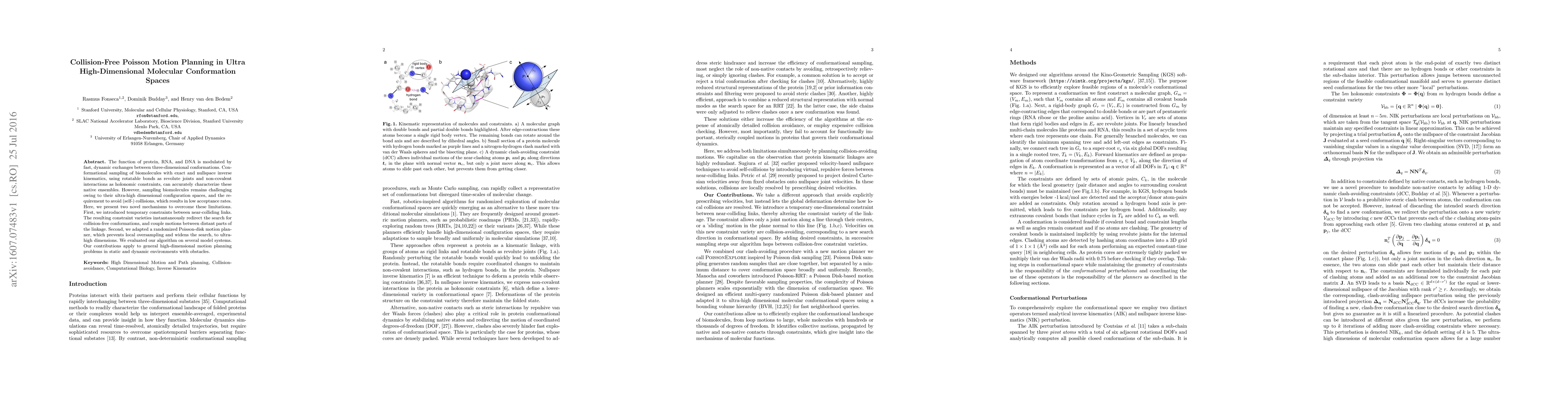 Researchers developed two novel methods to efficiently plan motion in ultra-high dimensional spaces without collisions, improving acceptance rates for biomolecule sampling. The methods involve temporary constraints and a randomized Poisson-disk motion planner.