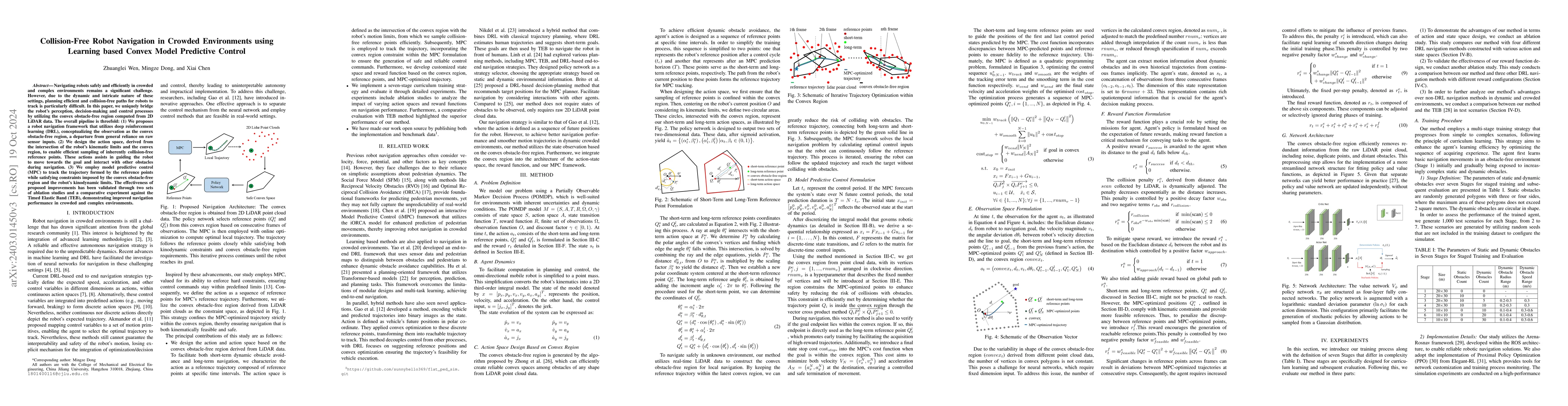 This paper proposes a robot navigation framework that combines deep reinforcement learning and convex model predictive control to efficiently navigate in crowded environments. It employs a unique approach by leveraging convex obstacle-free regions derived from LiDAR data to determine safe and efficient navigation paths.