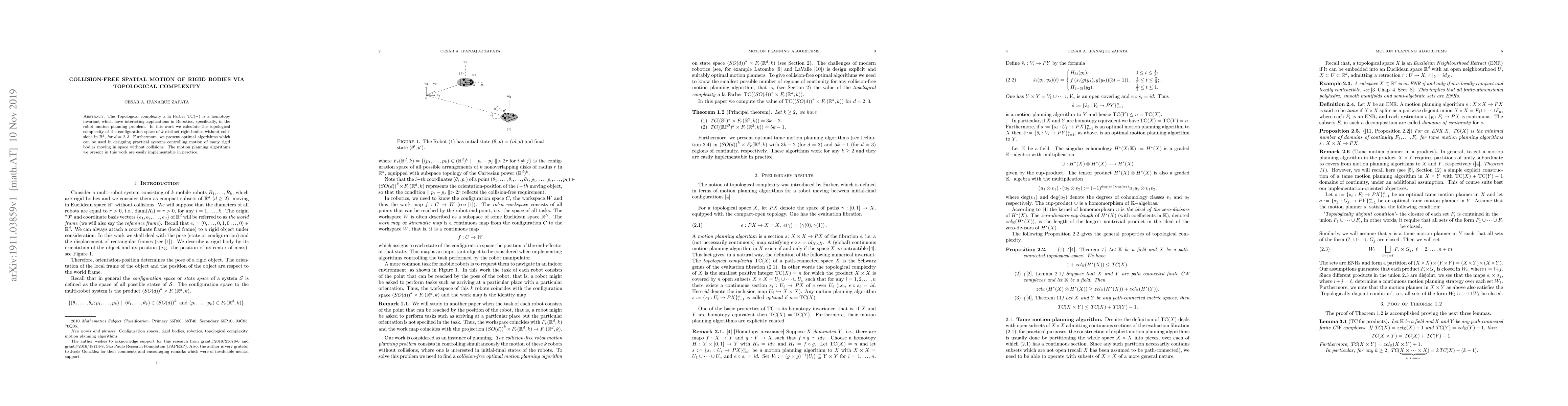 This paper calculates the topological complexity of the configuration space for $k$ distinct rigid bodies in $\mathbb{R}^d$ ($d=2,3$) to aid in collision-free motion planning. It also introduces practical algorithms for controlling the motion of multiple rigid bodies without collisions.
