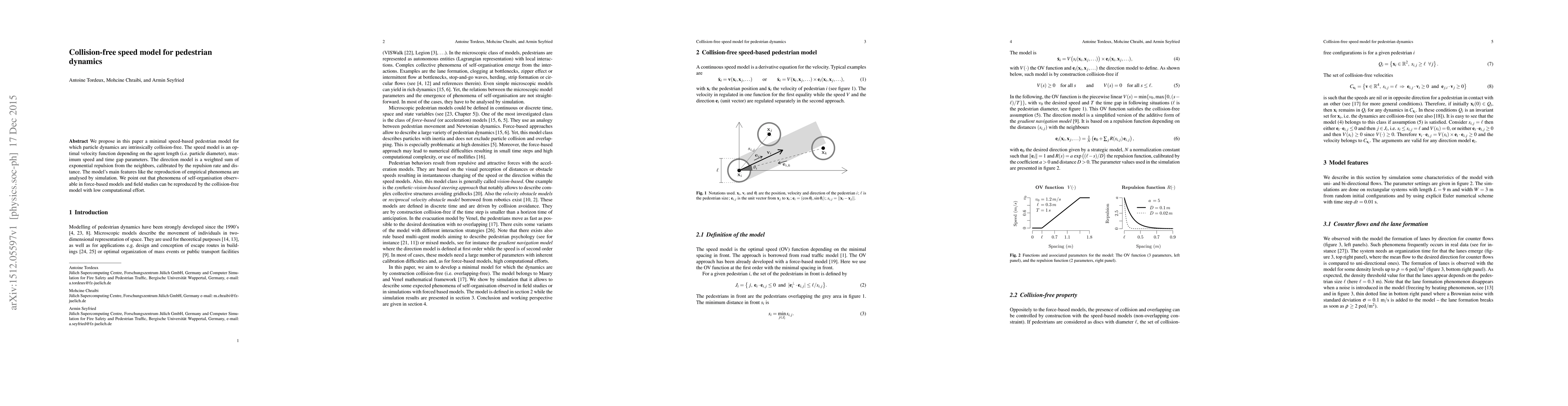 We propose in this paper a minimal speed-based pedestrian model for which particle dynamics are intrinsically collision-free. The speed model is an optimal velocity function depending on the agent length (i.e.\ particle diameter), maximum speed and time gap parameters. The direction model is a weighted sum of exponential repulsion from the neighbors, calibrated by the repulsion rate and distance. The model's main features like the reproduction of empirical phenomena are analysed by simulation. We point out that phenomena of self-organisation observable in force-based models and field studies can be reproduced by the collision-free model with low computational effort.