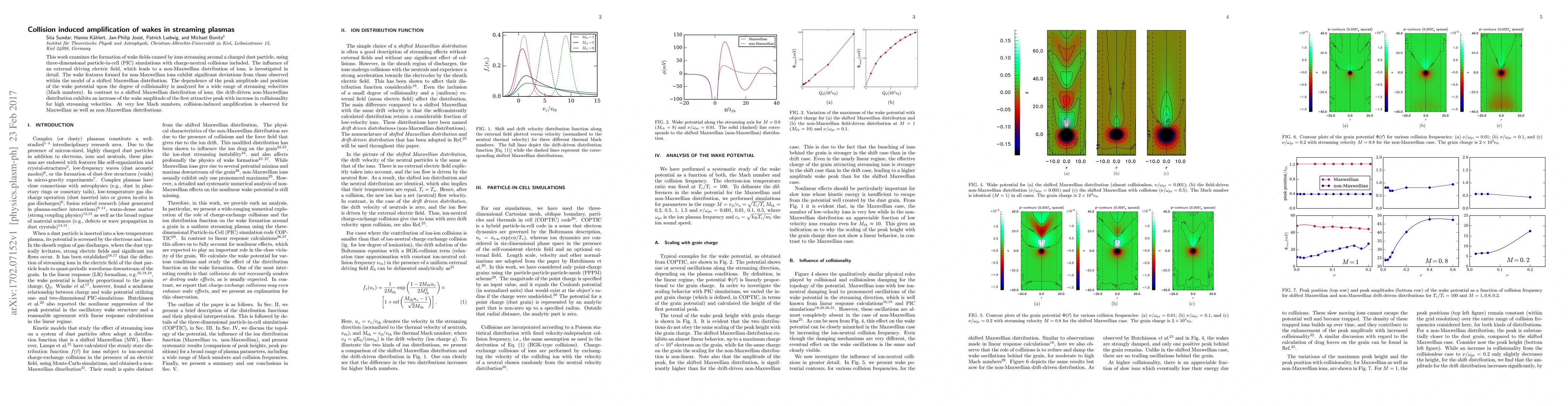 This work examines the formation of wake fields caused by ions streaming around a charged dust particle, using three-dimensional particle-in-cell (PIC) simulations with charge-neutral collisions included. The influence of an external driving electric field, which leads to a non-Maxwellian distribution of ions, is investigated in detail. The wake features formed for non-Maxwellian ions exhibit significant deviations from those observed within the model of a shifted Maxwellian distribution. The dependence of the peak amplitude and position of the wake potential upon the degree of collisionality is analyzed for a wide range of streaming velocities (Mach numbers). In contrast to a shifted Maxwellian distribution of ions, the drift-driven non-Maxwellian distribution exhibits an increase of the wake amplitude of the first attractive peak with increase in collisionality for high streaming velocities. At very low Mach numbers, collision-induced amplification is observed for Maxwellian as well as non-Maxwellian distributions.
