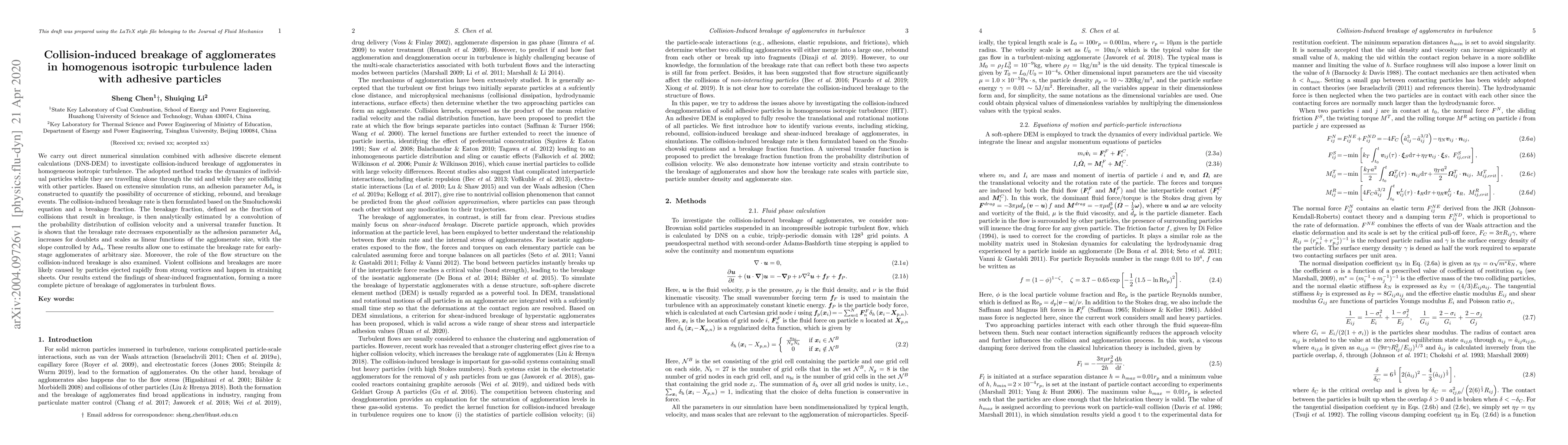 This study uses direct numerical simulations and adhesive discrete element calculations to determine the collision-induced breakage rate of agglomerates in homogeneous isotropic turbulence. The research formulates a breakage rate based on the Smoluchowski equation and identifies that breakage decreases with increasing adhesion parameter and scales linearly with agglomerate size.