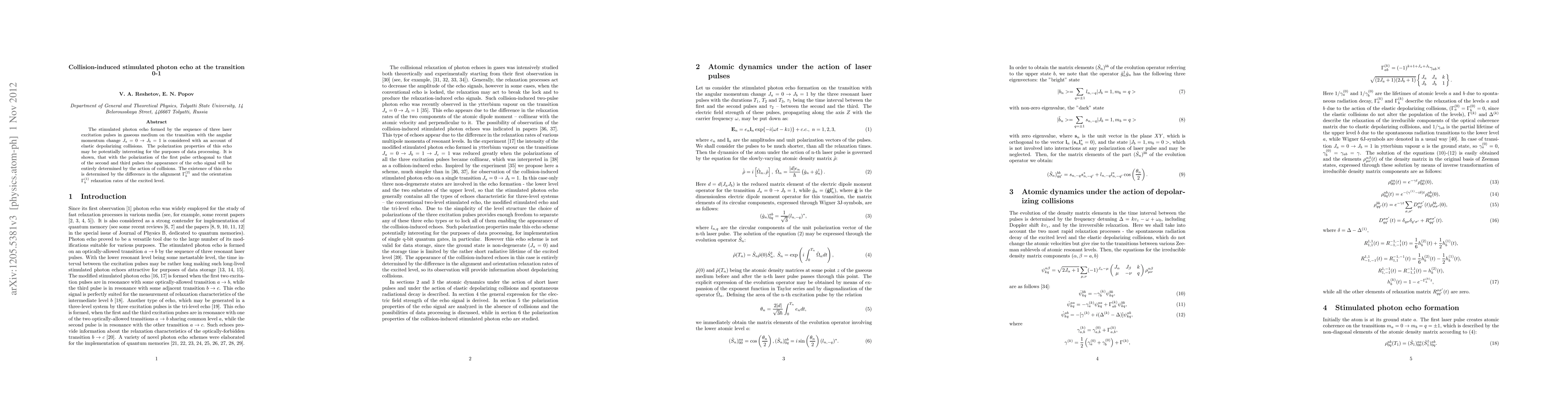 The stimulated photon echo formed by the sequence of three laser excitation pulses in gaseous medium on the transition with the angular momentum change 0-1 is considered with an account of elastic depolarizing collisions. The polarization properties of this echo may be potentially interesting for the purposes of data processing. It is shown, that with the polarization of the first pulse orthogonal to that of the second and third pulses the appearance of the echo signal will be entirely determined by the action of collisions. The existence of this echo is determined by the difference in the alignment and the orientation relaxation rates of the excited level.