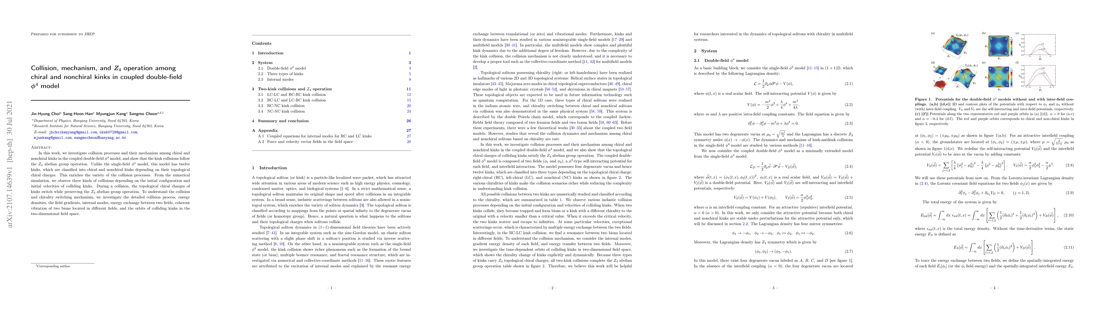 In this work, we investigate collision processes and their mechanism among chiral and nonchiral kinks in the coupled double-field $\phi^4$ model and show that the kink collisions follow the $Z_4$ abelian group operation. Unlike the single-field $\phi^4$ model, this model has twelve kinks, which are classified into chiral and nonchiral kinks depending on their topological chiral charges. This enriches the variety of the collision processes. From the numerical simulation, we observe three kinds of collisions depending on the initial configuration and initial velocities of colliding kinks. During a collision, the topological chiral charges of kinks switch while preserving the $Z_4$ abelian group operation. To understand the collision and chirality switching mechanism, we investigate the detailed collision process, energy densities, the field gradients, internal modes, energy exchange between two fields, coherent vibration of two bions located in different fields, and the orbits of colliding kinks in the two-dimensional field space.