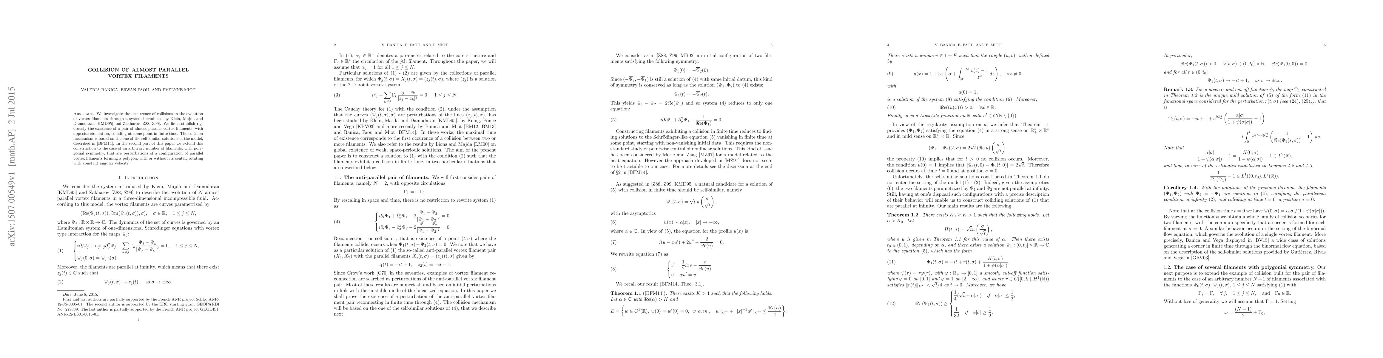 This paper rigorously establishes the existence of collisions between almost parallel vortex filaments with opposite circulation, using a model introduced by Klein, Majda, and Damodaran. It also extends the collision mechanism to configurations with multiple filaments forming a polygon, rotating with constant angular velocity.