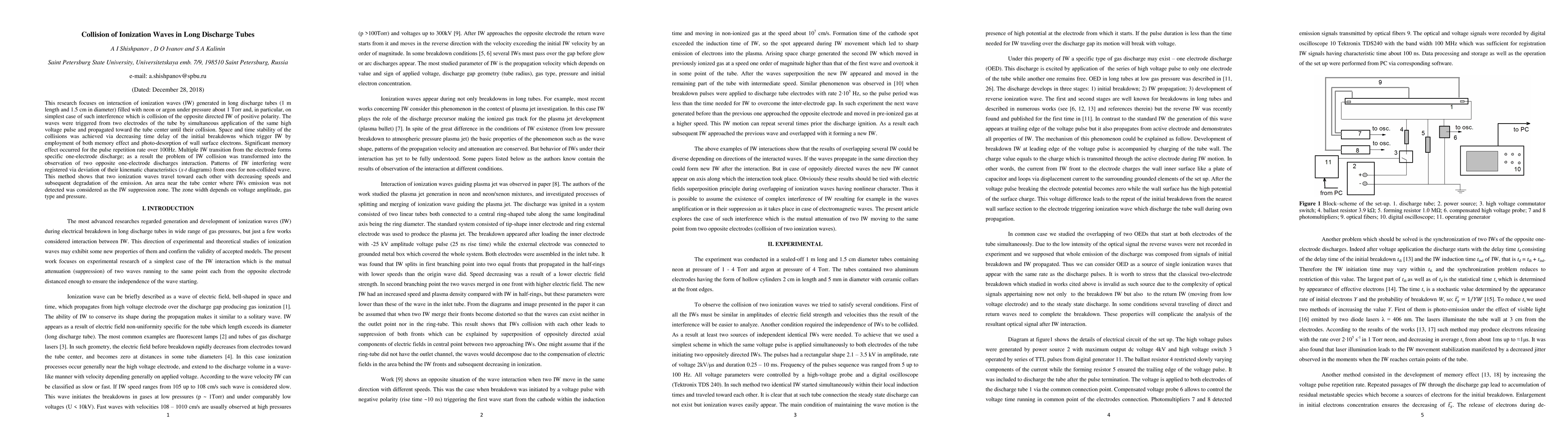 Researchers studied the collision of ionization waves in long discharge tubes, observing how they interact and suppress emission near the tube center, with key findings including a suppression zone width dependent on voltage amplitude, gas type, and pressure.