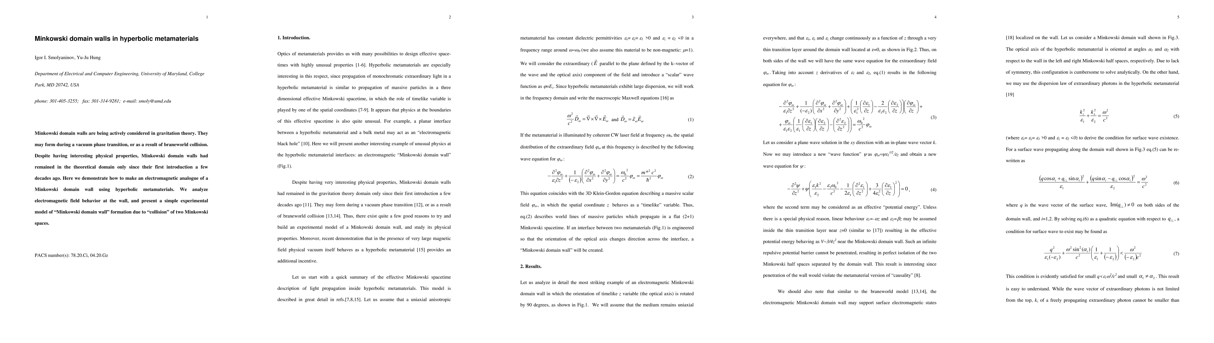 This paper demonstrates the experimental realization of an electromagnetic analogue of a Minkowski domain wall using hyperbolic metamaterials, providing insights into the behavior of electromagnetic fields at the wall and presenting a model for its formation through the collision of two Minkowski spaces.