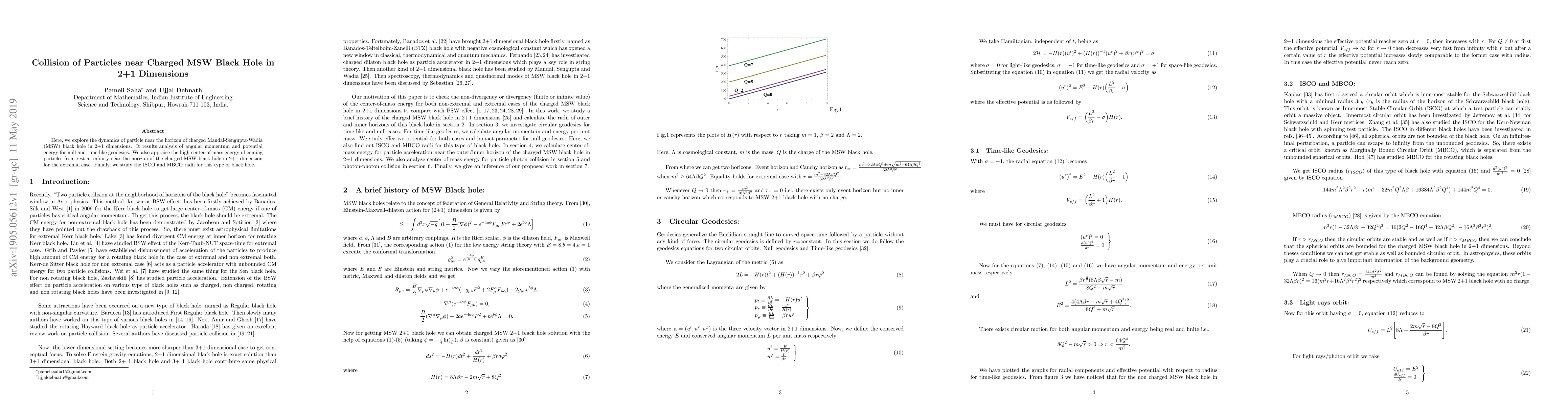 This paper investigates the dynamics of particles near the horizon of a charged MSW black hole in 2+1 dimensions, analyzing angular momentum and potential energy for null and time-like geodesics, and determining the high center-of-mass energy for colliding particles from rest at infinity, along with studying the ISCO and MBCO radii.