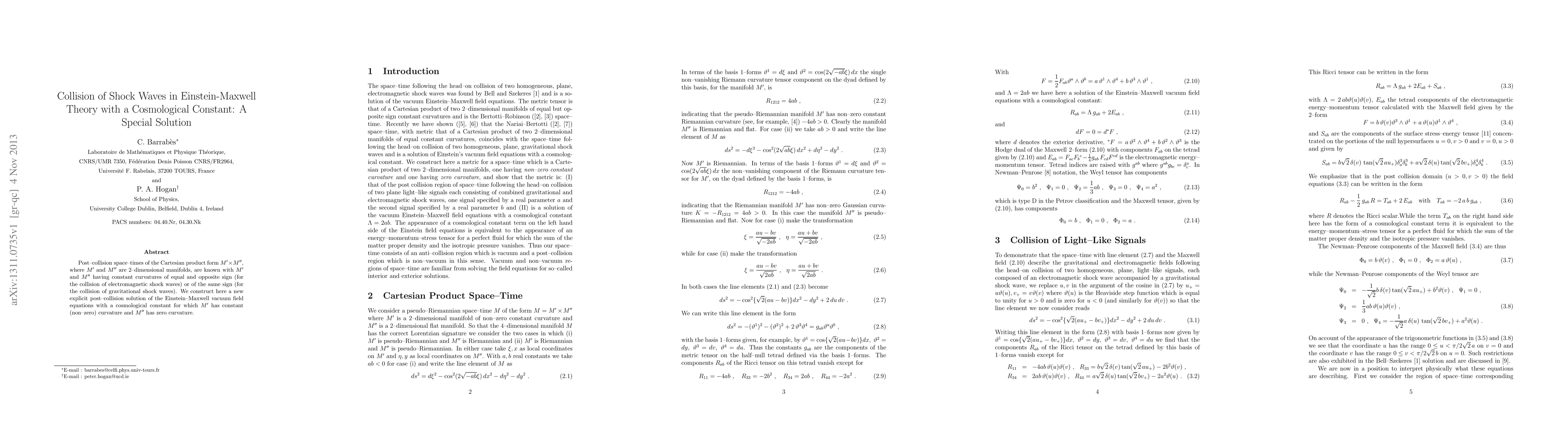 Post-collision space-times of the Cartesian product form M'xM'', where M' and M'' are two-dimensional manifolds, are known with M' and M'' having constant curvatures of equal and opposite sign (for the collision of electromagnetic shock waves) or of the same sign (for the collision of gravitational shock waves). We construct here a new explicit post-collision solution of the Einstein-Maxwell vacuum field equations with a cosmological constant for which M' has constant (nonzero) curvature and M'' has zero curvature.