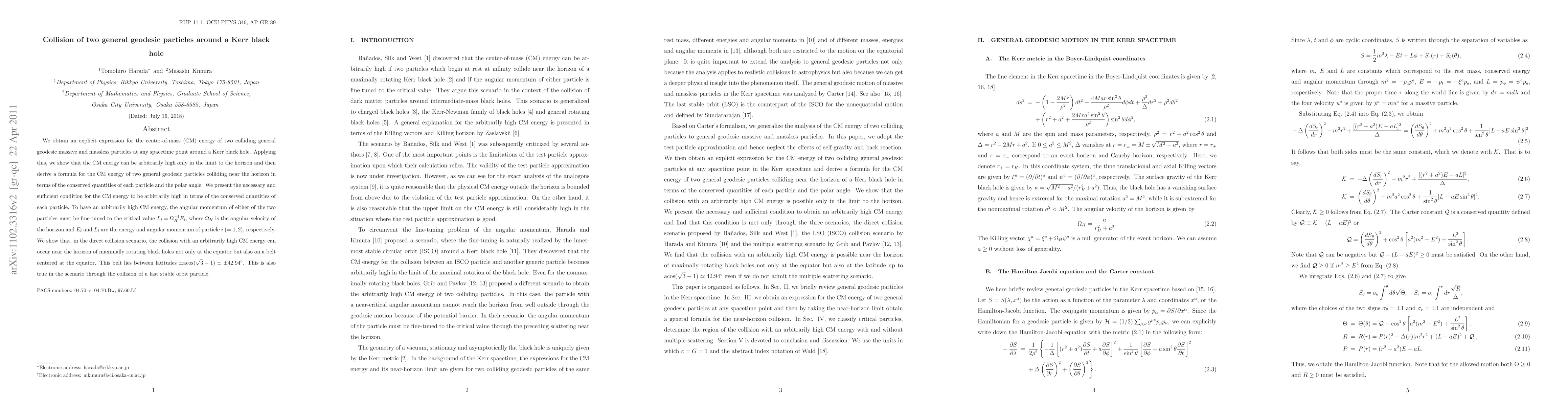 This paper derives an expression for the center-of-mass energy of two colliding geodesic particles around a Kerr black hole, showing that arbitrarily high energies are possible near the event horizon. The condition for such high energies requires fine-tuning the angular momentum of the particles to a critical value.