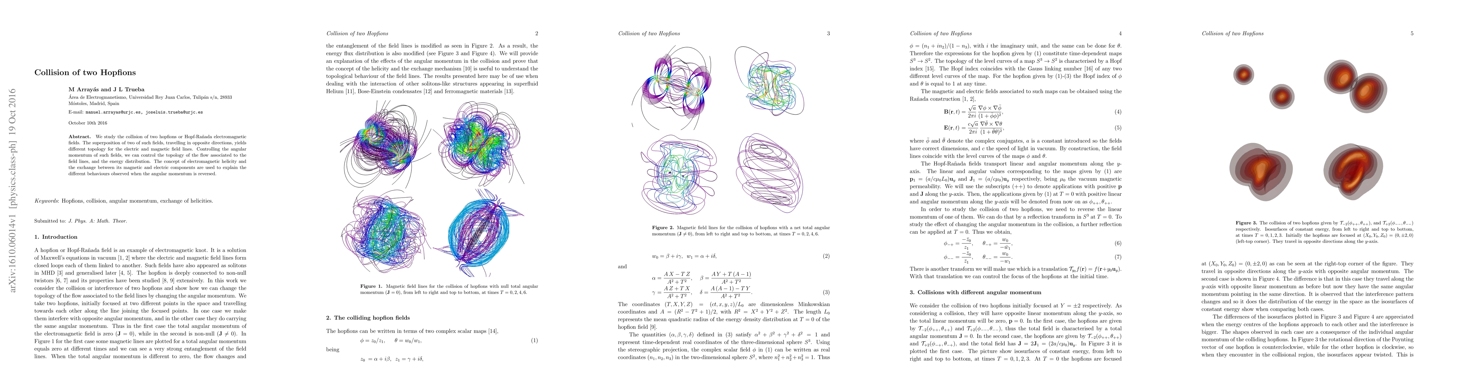 We study the collision of two hopfions or Hopf-Ra\~nada electromagnetic fields. The superposition of two of such fields, travelling in opposite directions, yields different topology for the electric and magnetic field lines. Controlling the angular momentum of such fields, we can control the topology of the flow associated to the field lines, and the energy distribution. The concept of electromagnetic helicity and the exchange between its magnetic and electric components are used to explain the different behaviours observed when the angular momentum is reversed.