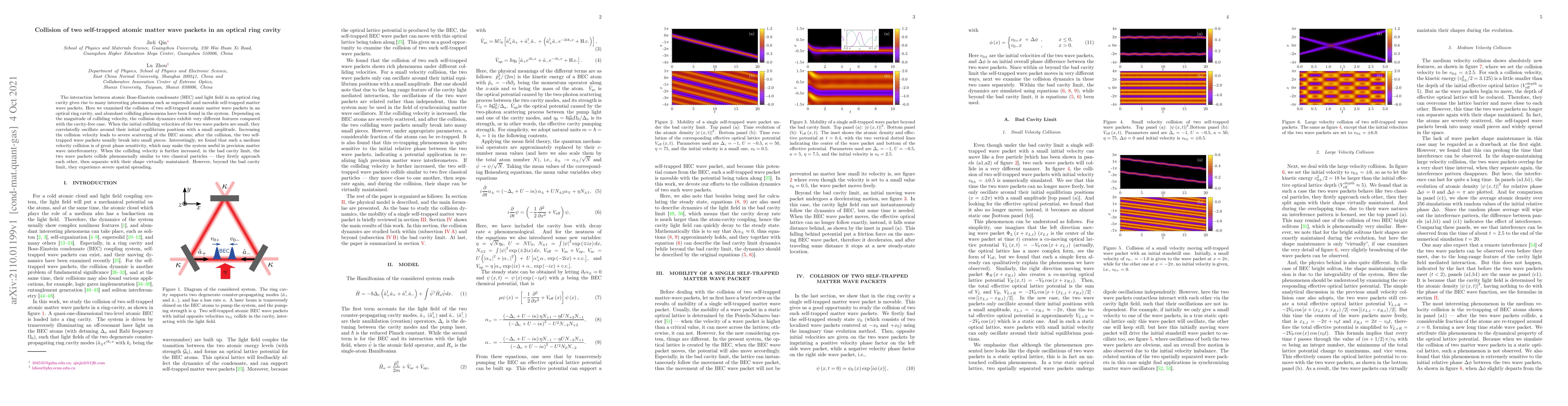 This study investigates the collision dynamics of two self-trapped atomic matter wave packets in an optical ring cavity, revealing distinct behaviors depending on the collision velocity. At low velocities, the wave packets oscillate around their initial positions, while higher velocities cause severe scattering and fragmentation, potentially useful for precision interferometry.