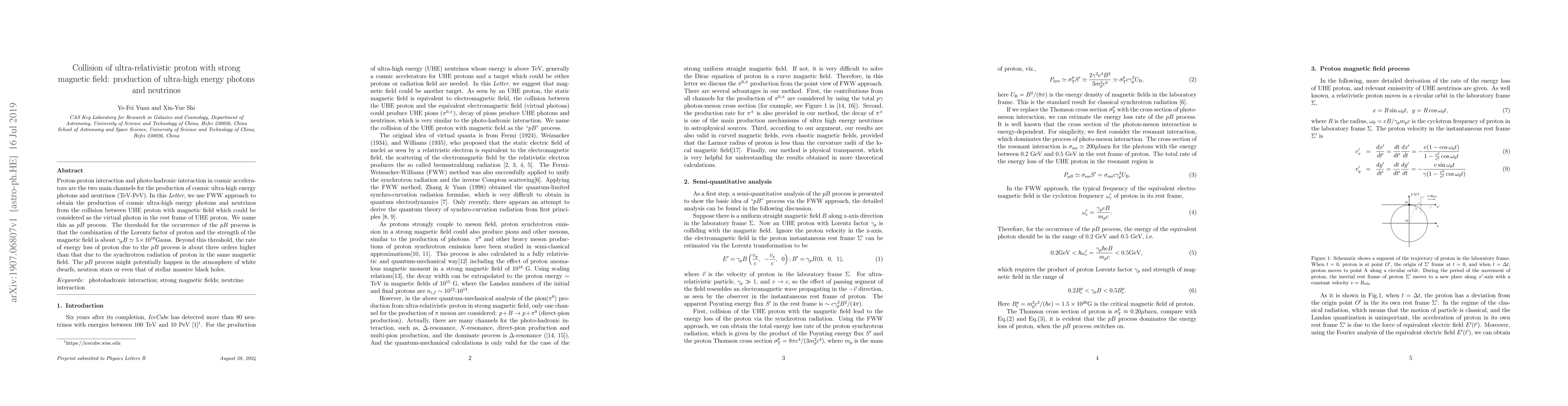 Proton-proton interaction and photo-hadronic interaction in cosmic accelerators are the two main channels for the production of cosmic ultra-high energy photons and neutrinos (TeV-PeV). In this Letter, we use FWW approach to obtain the production of cosmic ultra-high energy photons and neutrinos from the collision between UHE proton with magnetic field which could be considered as the virtualphoton in the rest frame of UHE proton. We name this as $pB$ process. The threshold for the occurrence of the $pB$ process is that the combination of the Lorentz factor of proton and the strength of the magnetic field is about $\gamma_p B \simeq 5\times 10^{18}$Gauss. Beyond this threshold, the rate of energy loss of proton due to the $pB$ process is about three orders higher than that due to the synchrotron radiation of proton in the same magnetic field. The $pB$ process might potentially happen in the atmosphere of white dwarfs, neutron stars or even that of stellar massive black holes.
