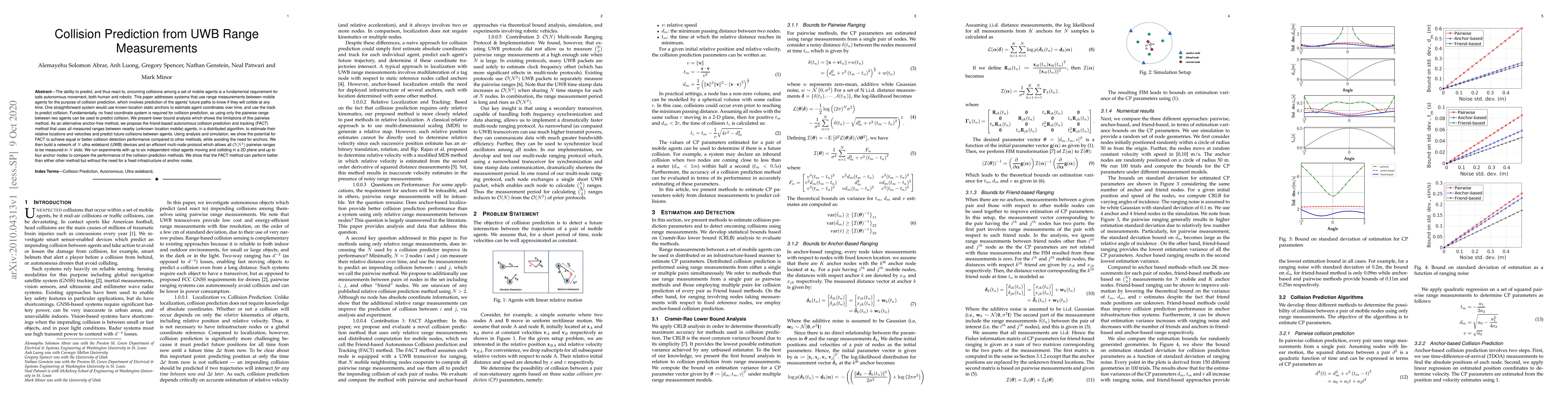 The ability to predict, and thus react to, oncoming collisions among a set of mobile agents is a fundamental requirement for safe autonomous movement, both human and robotic. This paper addresses systems that use range measurements between mobile agents for the purpose of collision prediction, which involves prediction of the agents' future paths to know if they will collide at any time. One straightforward system would use known-location static anchors to estimate agent coordinates over time, and use the track to predict collision. Fundamentally, no fixed coordinate system is required for collision prediction, so using only the pairwise range between two agents can be used to predict collision. We present lower bound analysis which shows the limitations of this pairwise method. As an alternative anchor-free method, we propose the friend-based autonomous collision prediction and tracking (FACT) method that uses all measured ranges between nearby (unknown location mobile) agents, in a distributed algorithm, to estimate their relative locations and velocities and predict future collisions between agents. Using analysis and simulation, we show the potential for FACT to achieve equal or better collision detection performance compared to other methods, while avoiding the need for anchors. We then build a network of $N$ ultra wideband (UWB) devices and an efficient multi-node protocol which allows all ${\cal O}(N^2)$ pairwise ranges to be measured in $N$ slots. We run experiments with up to six independent robot agents moving and colliding in a 2D plane and up to four anchor nodes to compare the performance of the collision prediction methods. We show that the FACT method can perform better than either other method but without the need for a fixed infrastructure of anchor nodes.