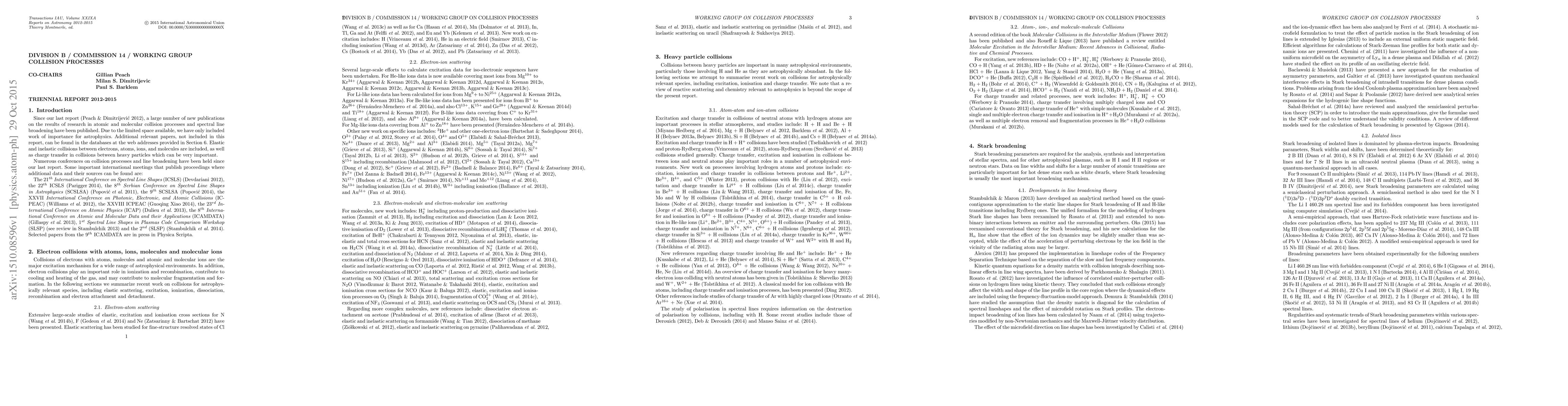 This report summarizes new publications on the results of research in atomic and molecular collision processes and spectral line broadening.
