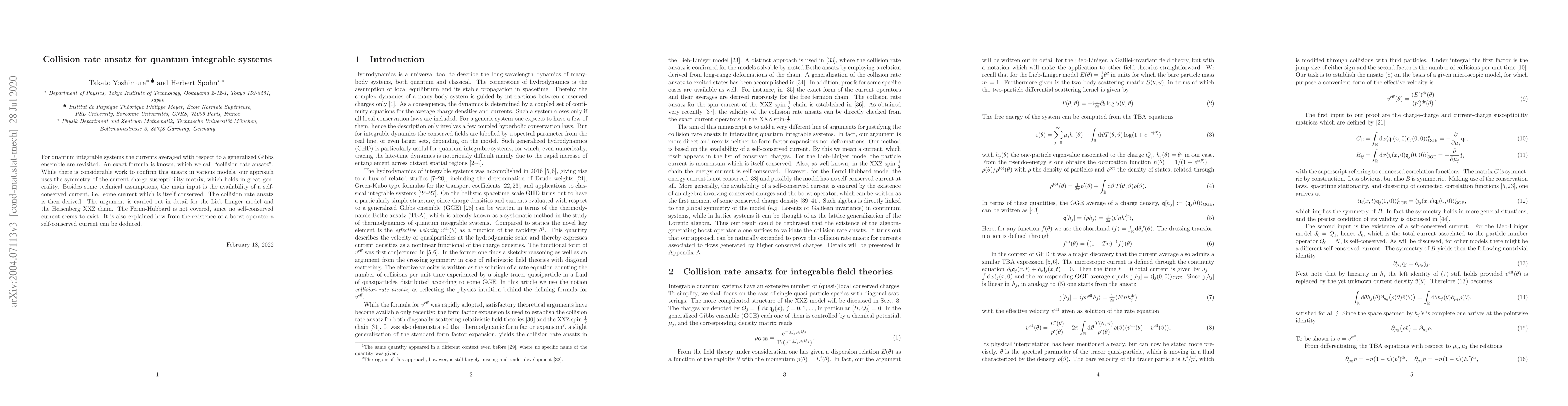 For quantum integrable systems the currents averaged with respect to a generalized Gibbs ensemble are revisited. An exact formula is known, which we call "collision rate ansatz". While there is considerable work to confirm this ansatz in various models, our approach uses the symmetry of the current-charge susceptibility matrix, which holds in great generality. Besides some technical assumptions, the main input is the availability of a self-conserved current, i.e. some current which is itself conserved. The collision rate ansatz is then derived. The argument is carried out in detail for the Lieb-Liniger model and the Heisenberg XXZ chain. The Fermi-Hubbard model is not covered, since no self-conserved current seems to exist. It is also explained how from the existence of a boost operator a self-conserved current can be deduced.