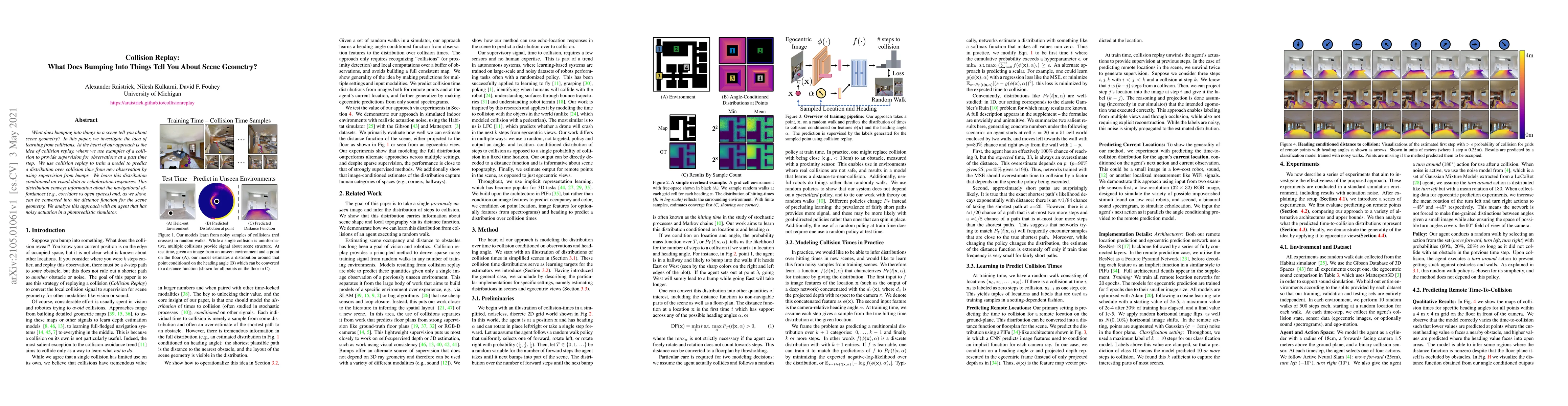 This paper explores using collision replay to infer scene geometry by training convolutional neural networks to predict collision times from images, which reveals navigational affordances and can generate distance functions for scene geometry. The method is tested in a photorealistic simulator with an agent experiencing noisy actuation.