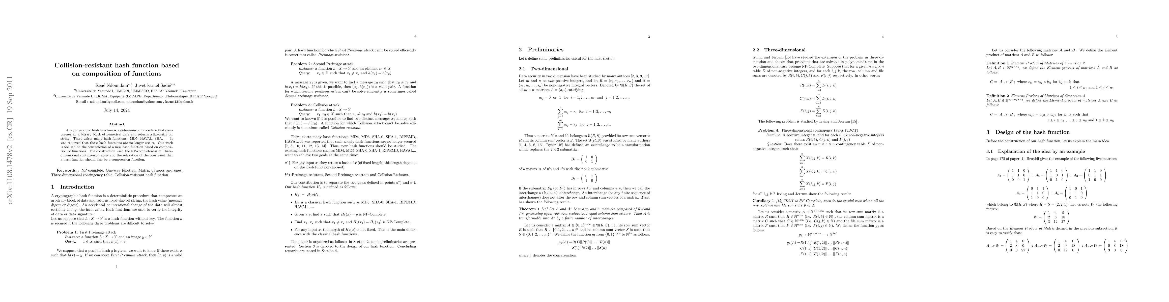 cryptographic hash function is a deterministic procedure that compresses an arbitrary block of numerical data and returns a fixed-size bit string. There exist many hash functions: MD5, HAVAL, SHA, ... It was reported that these hash functions are not longer secure. Our work is focused in the construction of a new hash function based on composition of functions. The construction used the NP-completeness of Three-dimensional contingency tables and the relaxation of the constraint that a hash function should also be a compression function.