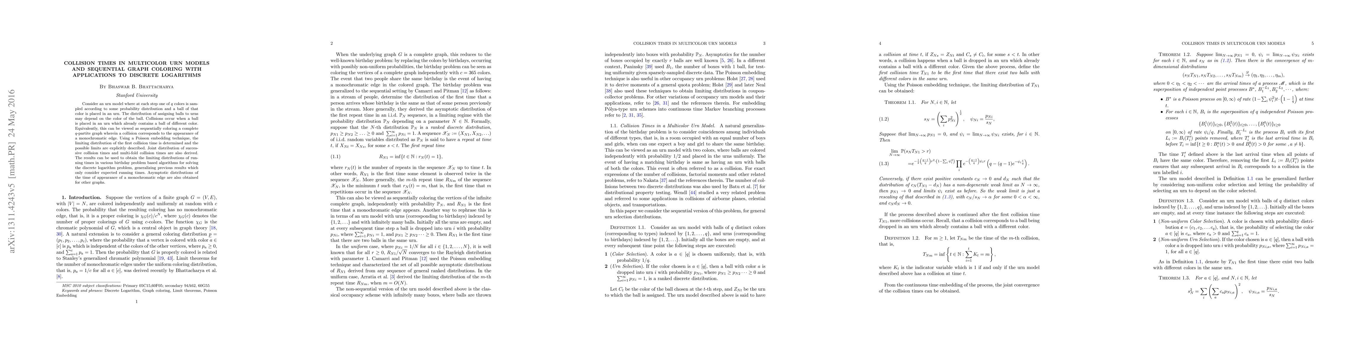 Consider an urn model where at each step one of $q$ colors is sampled according to some probability distribution and a ball of that color is placed in an urn. The distribution of assigning balls to urns may depend on the color of the ball. Collisions occur when a ball is placed in an urn which already contains a ball of different color. Equivalently, this can be viewed as sequentially coloring a complete $q$-partite graph wherein a collision corresponds to the appearance of a monochromatic edge. Using a Poisson embedding technique, the limiting distribution of the first collision time is determined and the possible limits are explicitly described. Joint distribution of successive collision times and multi-fold collision times are also derived. The results can be used to obtain the limiting distributions of running times in various birthday problem based algorithms for solving the discrete logarithm problem, generalizing previous results which only consider expected running times. Asymptotic distributions of the time of appearance of a monochromatic edge are also obtained for other graphs.