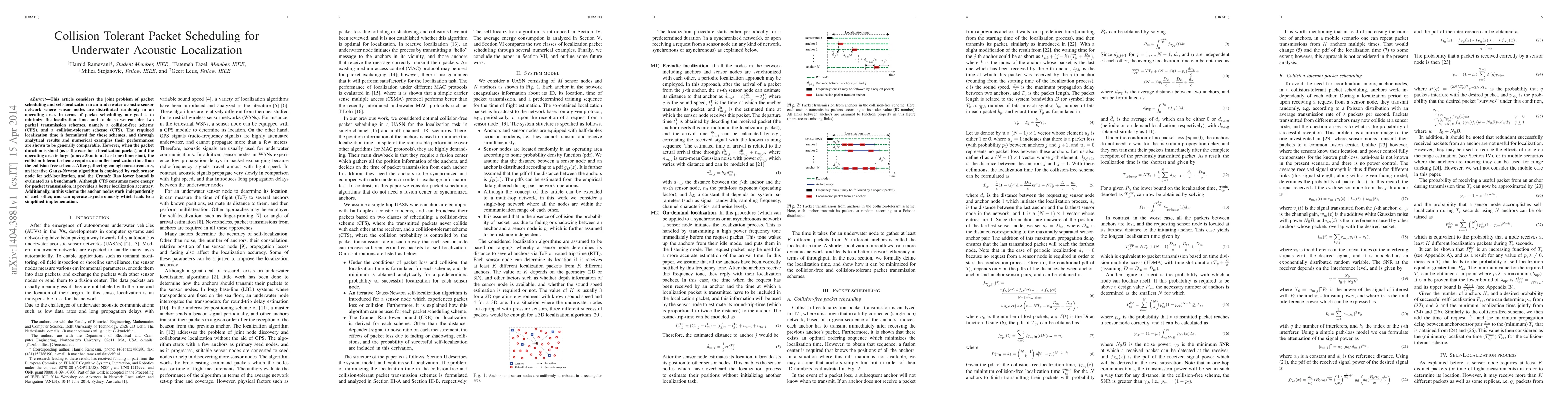 A study compares two packet scheduling schemes for underwater acoustic sensor networks: collision-free and collision-tolerant, finding that the latter outperforms in large operating areas with short localization packets.