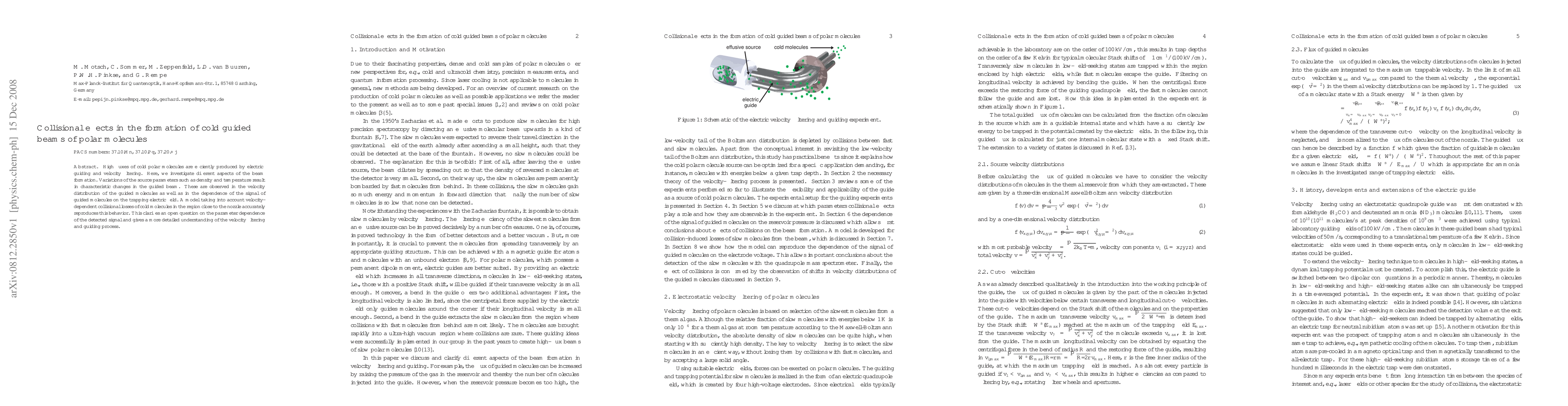 This paper investigates the formation of cold guided beams of polar molecules, showing how variations in source parameters affect beam characteristics. A model accounting for collisional losses near the nozzle accurately reproduces observed changes, providing insights into the guiding and velocity filtering process.