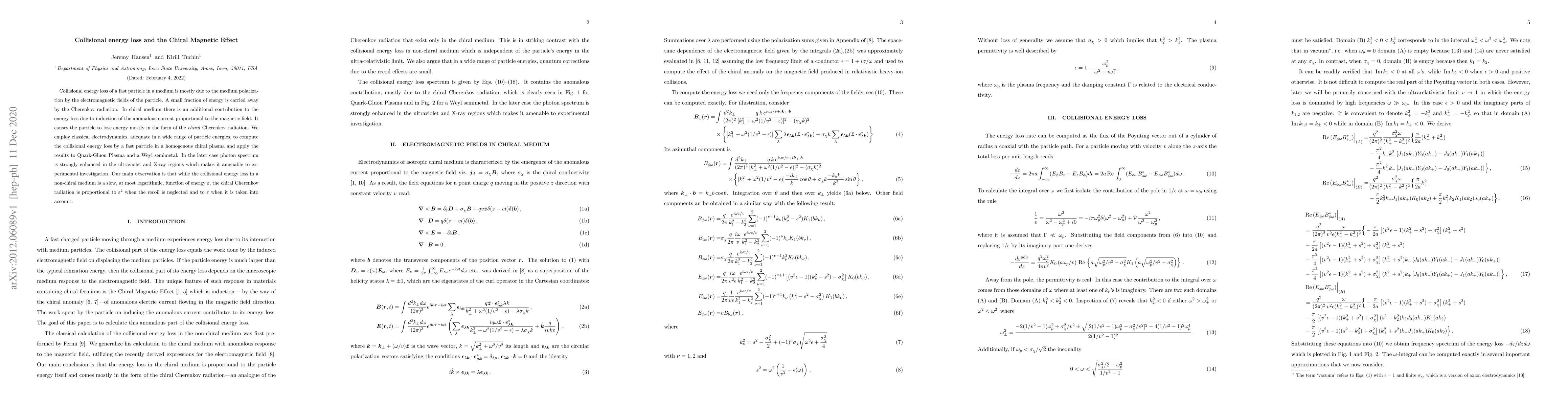 Collisional energy loss of a fast particle in a medium is mostly due to the medium polarization by the electromagnetic fields of the particle. A small fraction of energy is carried away by the Cherenkov radiation. In chiral medium there is an additional contribution to the energy loss due to induction of the anomalous current proportional to the magnetic field. It causes the particle to lose energy mostly in the form of the \emph{chiral} Cherenkov radiation. We employ classical electrodynamics, adequate in a wide range of particle energies, to compute the collisional energy loss by a fast particle in a homogenous chiral plasma and apply the results to Quark-Gluon Plasma and a Weyl semimetal. In the later case photon spectrum is strongly enhanced in the ultraviolet and X-ray regions which makes it amenable to experimental investigation. Our main observation is that while the collisional energy loss in a non-chiral medium is a slow, at most logarithmic, function of energy $E$, the chiral Cherenkov radiation is proportional to $E^2$ when the recoil is neglected and to $E$ when it is taken into account.