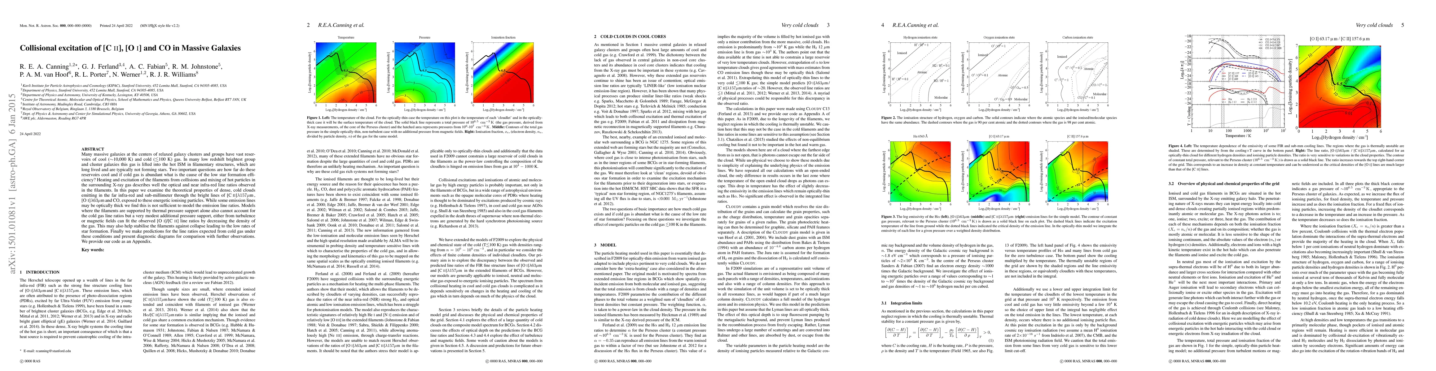 Many massive galaxies at the centres of relaxed galaxy clusters and groups have vast reservoirs of cool (~10,000 K) and cold (~100 K) gas. In many low redshift brightest group and cluster galaxies this gas is lifted into the hot ISM in filamentary structures, which are long lived and are typically not forming stars. Two important questions are how far do these reservoirs cool and if cold gas is abundant what is the cause of the low star formation efficiency? Heating and excitation of the filaments from collisions and mixing of hot particles in the surrounding X-ray gas describes well the optical and near infra-red line ratios observed in the filaments. In this paper we examine the theoretical properties of dense, cold clouds emitting in the far infra-red and submillimeter through the bright lines of [C II]157 \mu m , [O I]63 \mu m and CO, exposed to these energetic ionising particles. While some emission lines may be optically thick we find this is not sufficient to model the emission line ratios. Models where the filaments are supported by thermal pressure support alone also cannot account for the cold gas line ratios but a very modest additional pressure support, either from turbulence or magnetic fields can fit the observed [O I]/[C II] line ratios by decreasing the density of the gas. This may also help stabilise the filaments against collapse leading to the low rates of star formation. Finally we make predictions for the line ratios expected from cold gas under these conditions and present diagnostic diagrams for comparison with further observations. We provide our code as an Appendix.