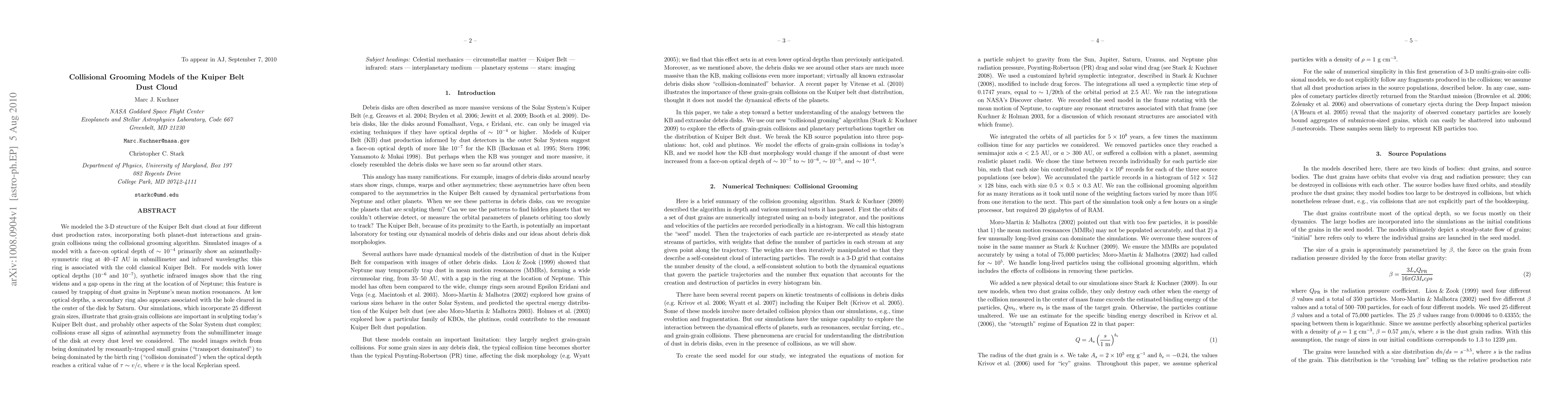 We modeled the 3-D structure of the Kuiper Belt dust cloud at four different dust production rates, incorporating both planet-dust interactions and grain-grain collisions using the collisional grooming algorithm. Simulated images of a model with a face-on optical depth of ~10^-4 primarily show an azimuthally-symmetric ring at 40-47 AU in submillimeter and infrared wavelengths; this ring is associated with the cold classical Kuiper Belt. For models with lower optical depths (10^-6 and 10^-7), synthetic infrared images show that the ring widens and a gap opens in the ring at the location of of Neptune; this feature is caused by trapping of dust grains in Neptune's mean motion resonances. At low optical depths, a secondary ring also appears associated with the hole cleared in the center of the disk by Saturn. Our simulations, which incorporate 25 different grain sizes, illustrate that grain-grain collisions are important in sculpting today's Kuiper Belt dust, and probably other aspects of the Solar System dust complex; collisions erase all signs of azimuthal asymmetry from the submillimeter image of the disk at every dust level we considered. The model images switch from being dominated by resonantly-trapped small grains ("transport dominated") to being dominated by the birth ring ("collision dominated") when the optical depth reaches a critical value of tau ~ v/c, where v is the local Keplerian speed.