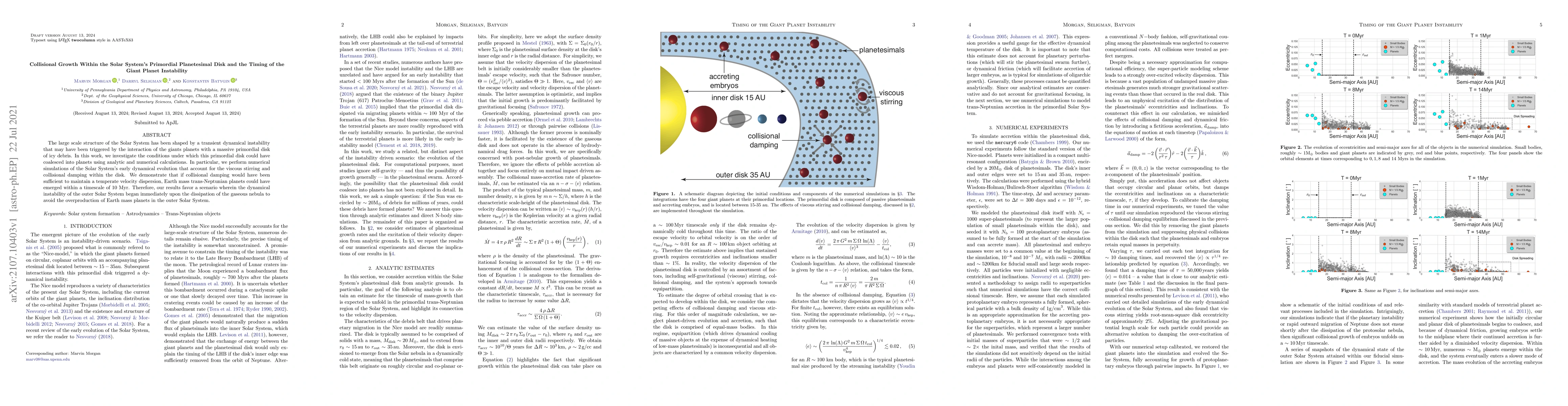 This paper investigates how collisional damping in a primordial disk of icy debris could lead to the formation of Earth mass trans-Neptunian planets within 10 Myr, suggesting that the giant planet instability occurred shortly after the dissipation of the gaseous nebula. The findings support the idea that the Solar System's large-scale structure was shaped by this early dynamical instability.